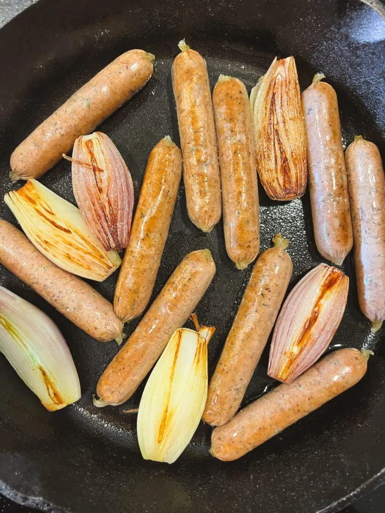 Traditional recipes don’t call for shallots but I liked both the flavor they added and if you can find longer banana shallots, they mimic the shape of the sausages somewhat. Make sure to brown the sausages and shallots well. Although a lot of the sausages sink and are covered some will poke out of the top of the finished bake.