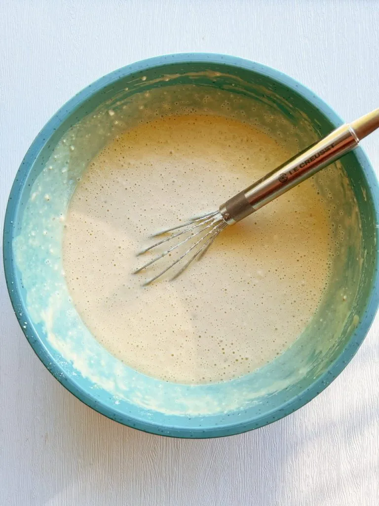 The batter should be the consistency of a pancake batter and needs to rest for an hour in the fridge before baking so plan ahead or you can even make it the night before so it’s ready when you are in the morning. I’ve seen recipes using aquafaba (liquid from canned chickpeas) but real eggs have fat and I found using Just Egg was the perfect substitute. I have used what I call a “rich” aquafaba egg in the past with flax and oil added but I haven’t tested it, so not sure it will work as well.