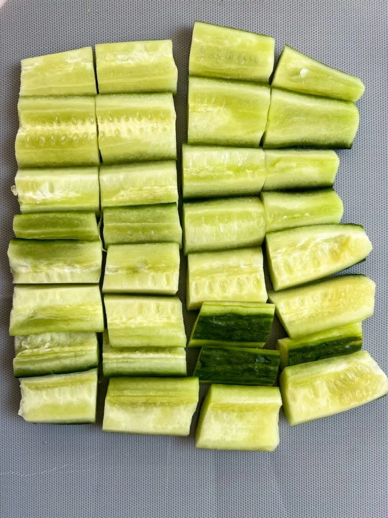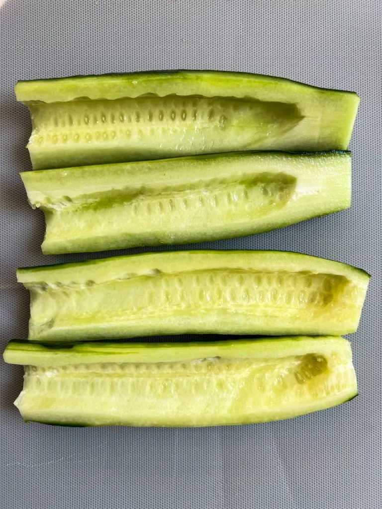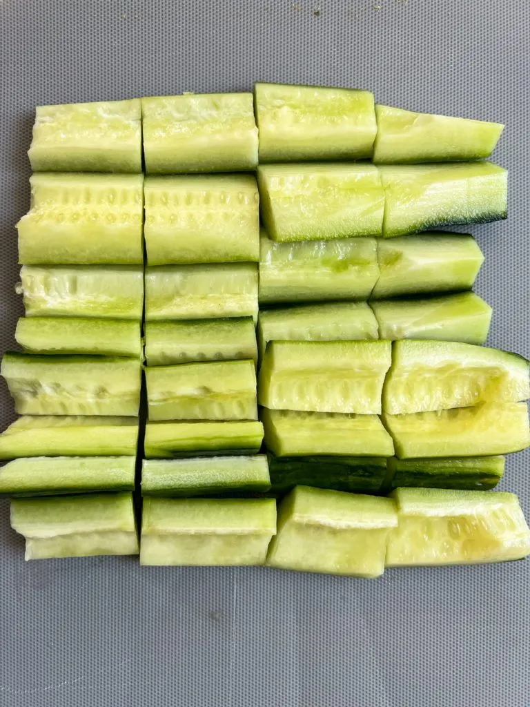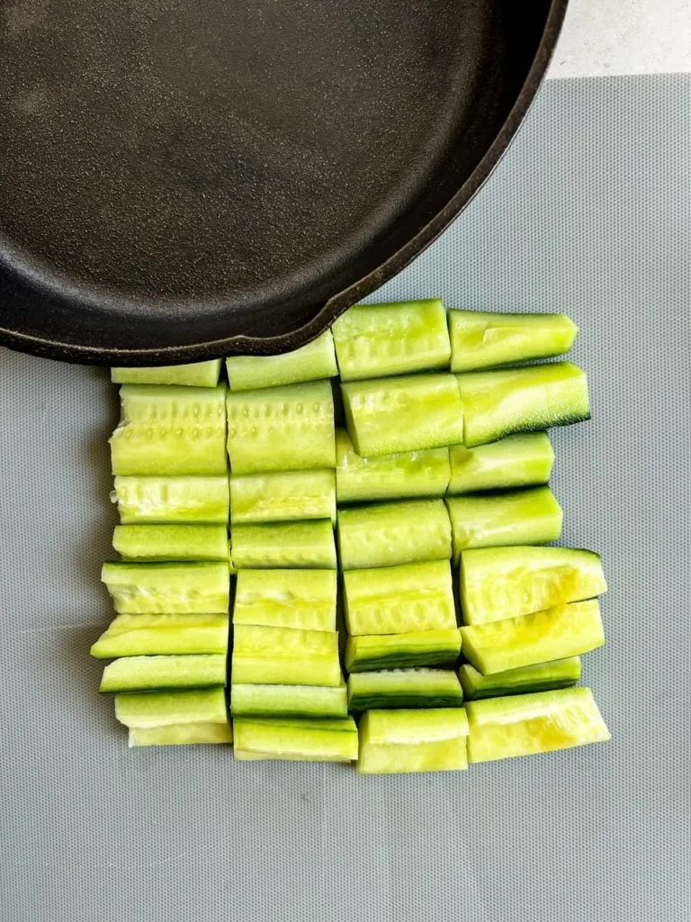 I prefer using English (or European) cucumbers for this recipe as they have less water in them and the seeds are easier to remove. These are the longer cucumbers you may see at the store. I usually peel most (not all) of the skins off a large cucumber, slice it half lengthwise then using a small spoon, scoop out the seeds. Then I cut each half again in half lengthwise and chop them into even small pieces. Using a heavy pan, I cover the cucumbers with a few paper towels then press the pan on top to smash them slightly. You don’t want them completely crushed but you want to remove some of the liquid. This will help them absorb the dressing.