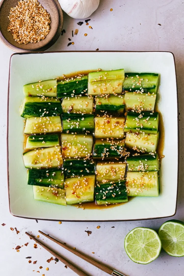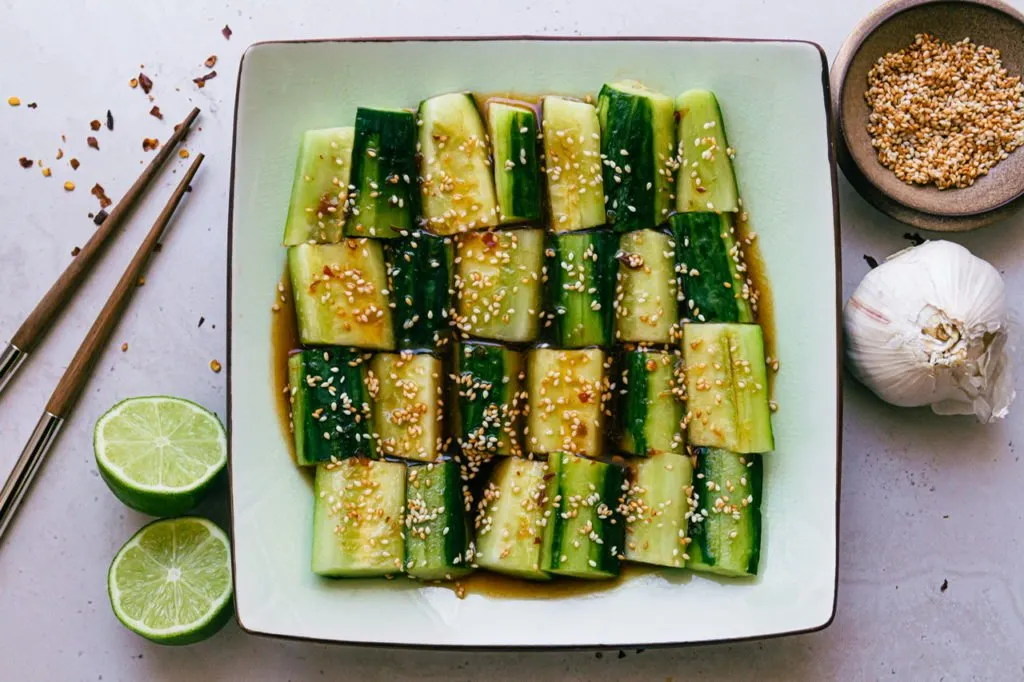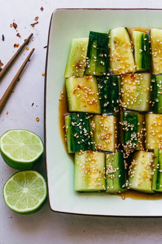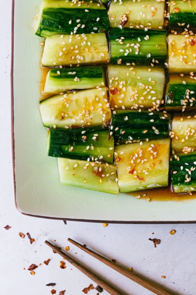 This is great as a side dish but also as a main with some crispy tofu on top. The dressing is really the star and is great not only on these cucumbers but as a marinade for any vegan protein, or as a dipping sauce for dumplings or scallion pancakes!
