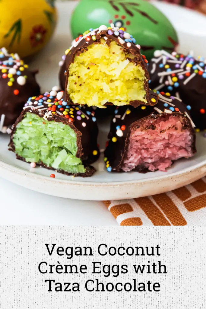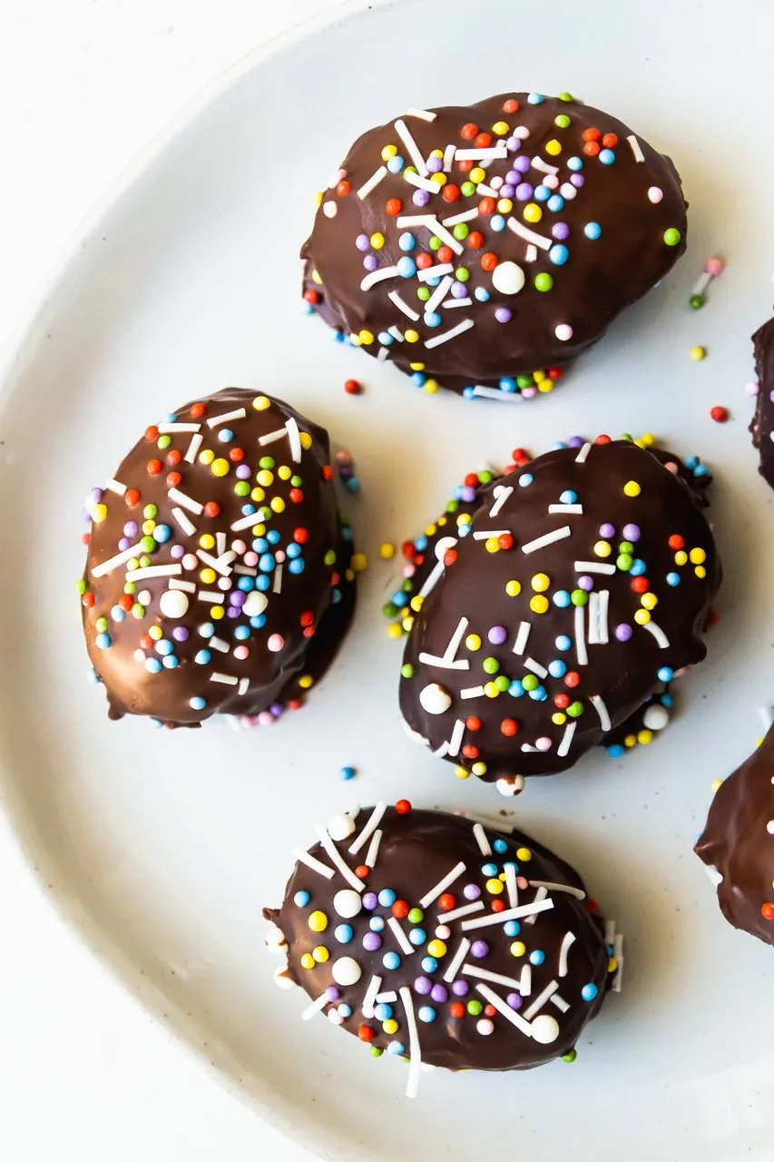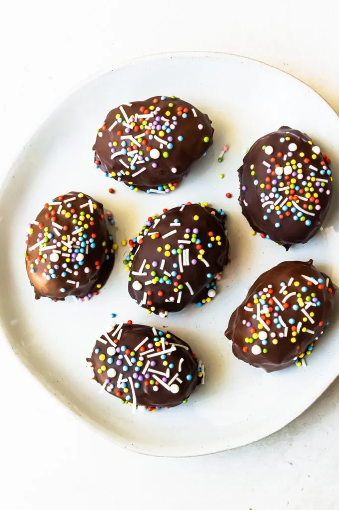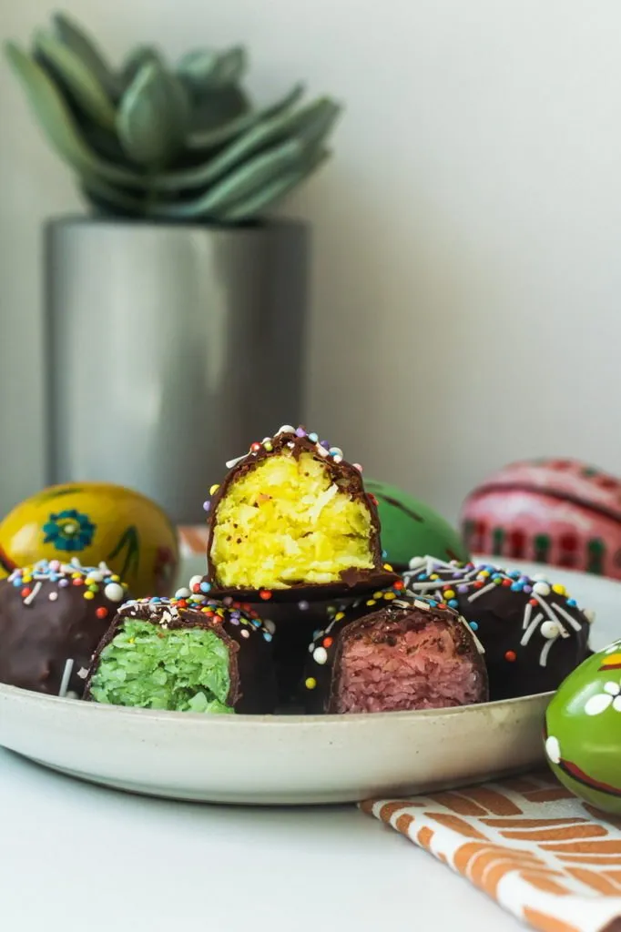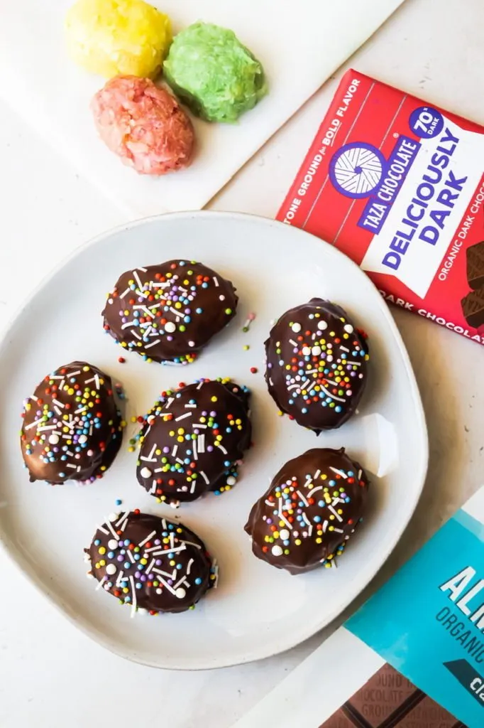 The filling is just two ingredients and you can tint it using natural food coloring or leave them plain. You just need to melt the chocolate then dip shaped coconut “eggs” into it and let them set. Sprinkles are optional but recommended! This would be a super fun project to make with the kiddos.