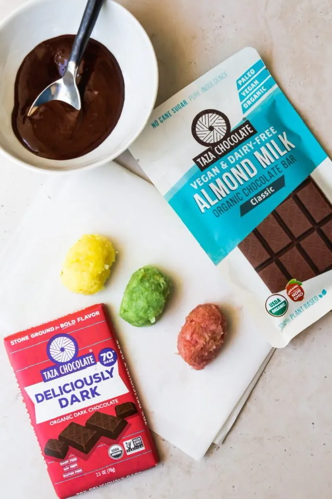 This is a super easy recipe for spring or Easter made with Taza chocolate and a few other ingredients! Taza makes dark and almond milk chocolate so you can coat them with dark or milk (or both like I did!).
