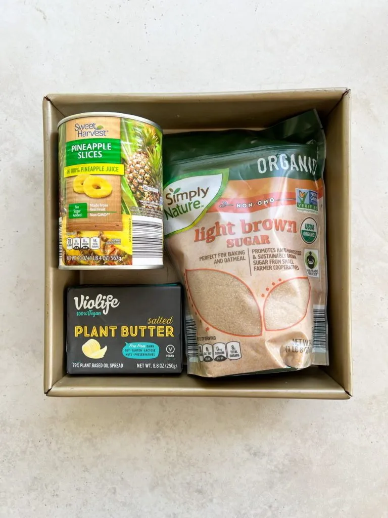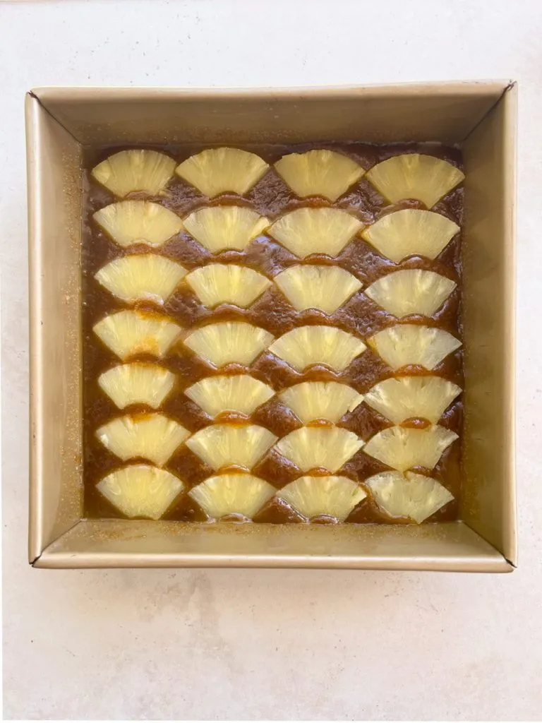 You’re going to mix the topping right in the baking pan. Add the melted vegan butter and brush it slightly up the sides of the pan. Then add the brown sugar and mix until it becomes a thick paste-like mixture. Then layer the pineapples in the pan and set aside. Then you add the batter and bake.