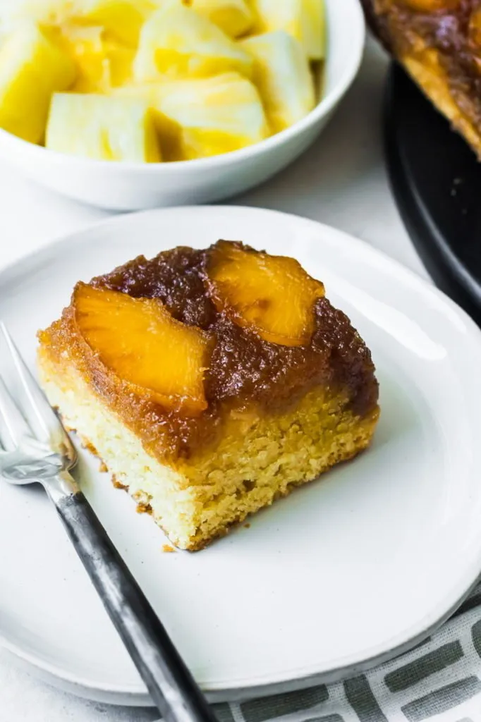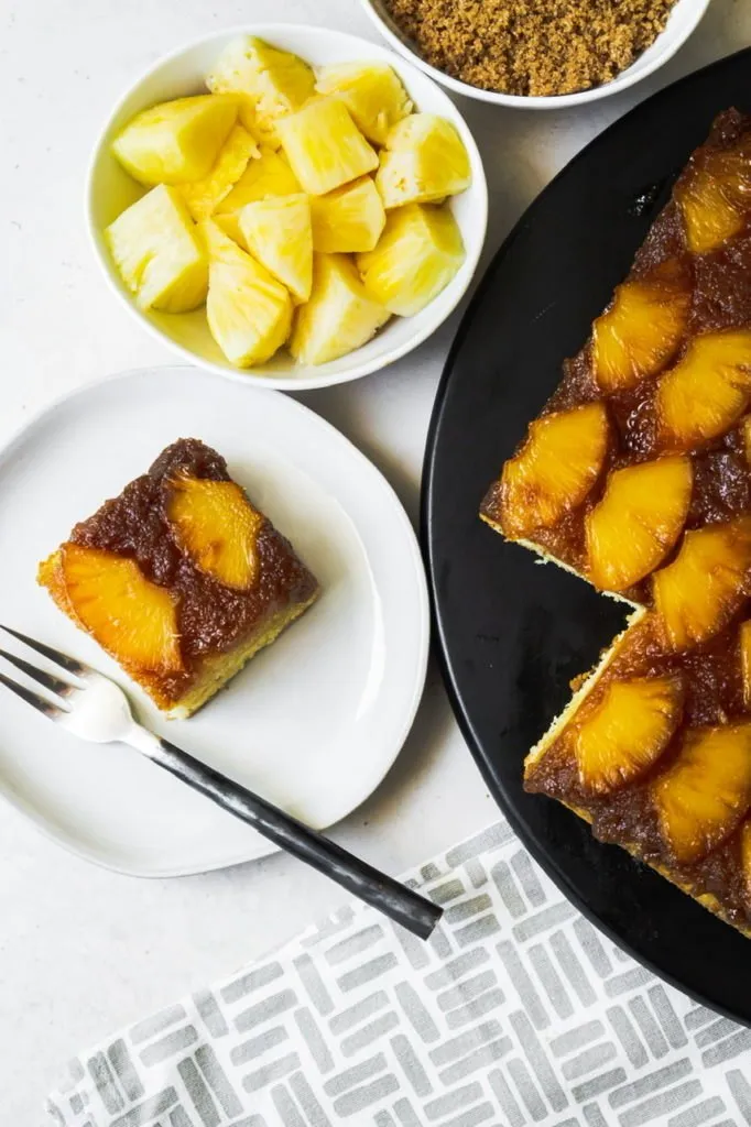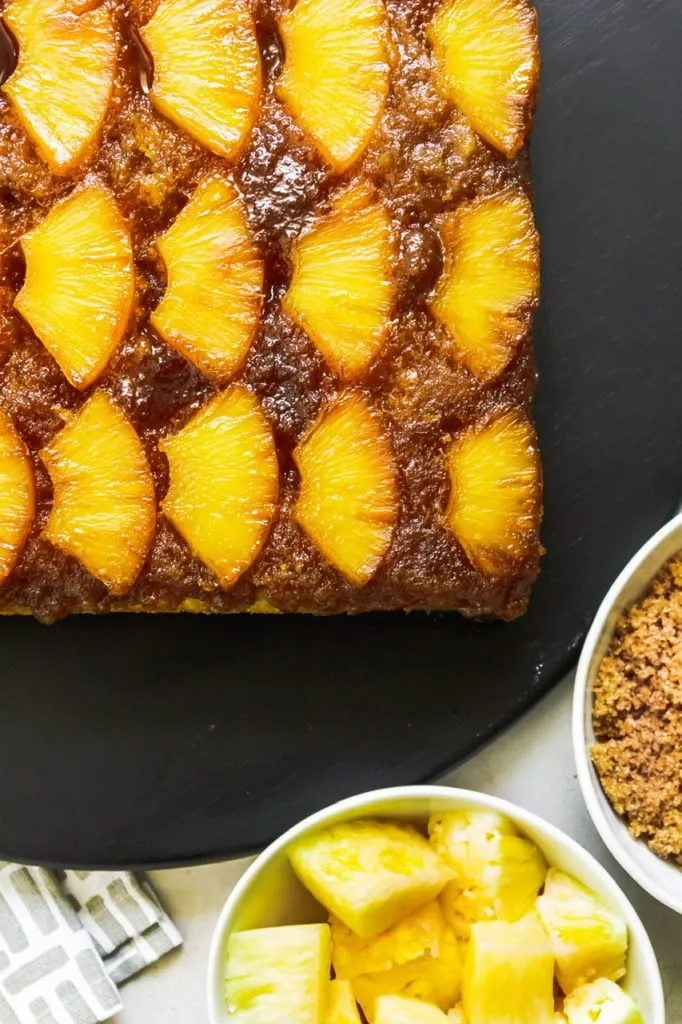 Pineapple upside down cake was always a go-to dessert at my house growing up. My mom made it frequently but always with a boxed yellow cake mix, canned pineapple and maraschino cherries. It was really quite simple to make but I’ve never had great luck veganizing boxed cake mixes so I’ve tried for years to make a version that tasted like the boxed cake I remembered but better and I think I’ve finally done it!