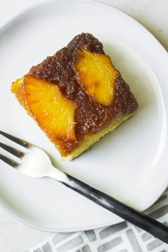 My mom always made this cake in a round pan and keep the pineapple circles whole and placed a cherry inside each one. I’m taking another approach and cutting the circles into four equal pieces and stacking them in a nice pattern and using a square baking pan. Oh and no cherries. I don’t like them but if you do, feel free to add some! Also keep in mind that canned pineapple is really best for this recipe. Fresh pineapple has a lot of moisture and that’s not good here. You even want to pat the canned pineapple dry with paper towels really well.
