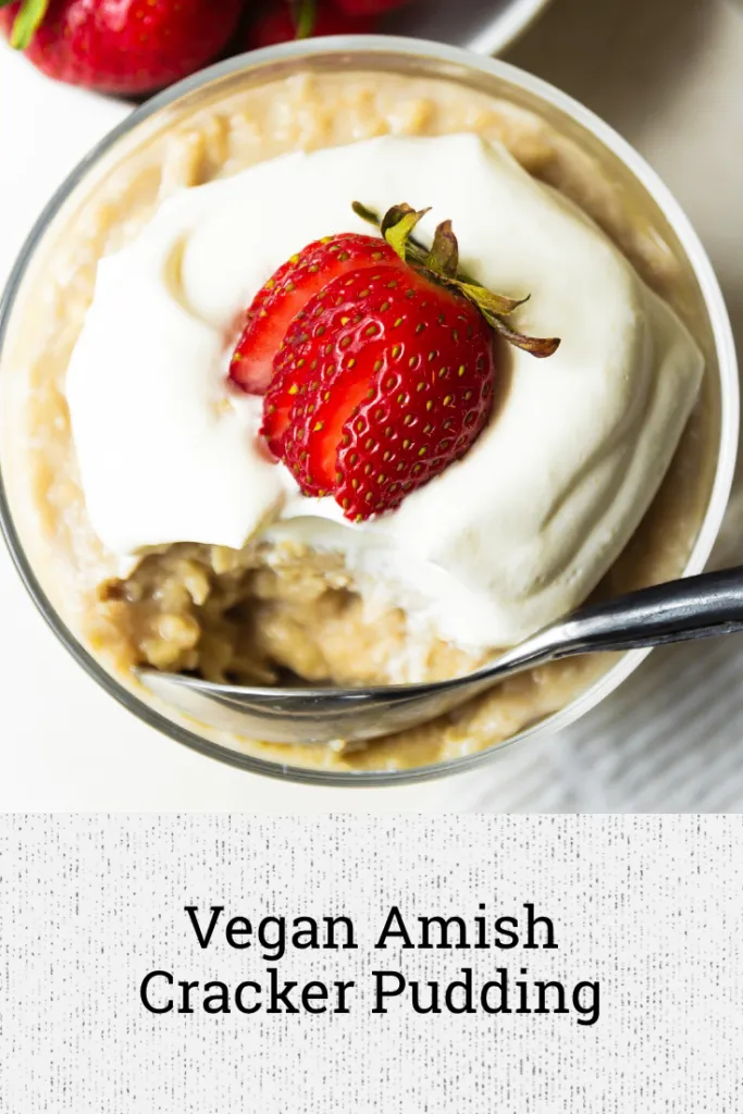So you’re probably saying “what is cracker pudding?”. Its basically vanilla pudding with crushed soda crackers like Saltines and coconut added. It’s a popular Amish sweet and I first had it when I was young at Good ‘n Plenty restaurant in Lancaster, PA which I read closed this year. It was a family style restaurant and had a huge bakery downstairs. This was a dessert served at the end of the meal and I’d never had anything like it before but always loved it. This was before I was vegan so I’ve tried to make it vegan over the years but have finally “cracked” the recipe. Get it?