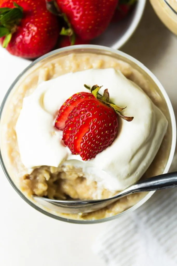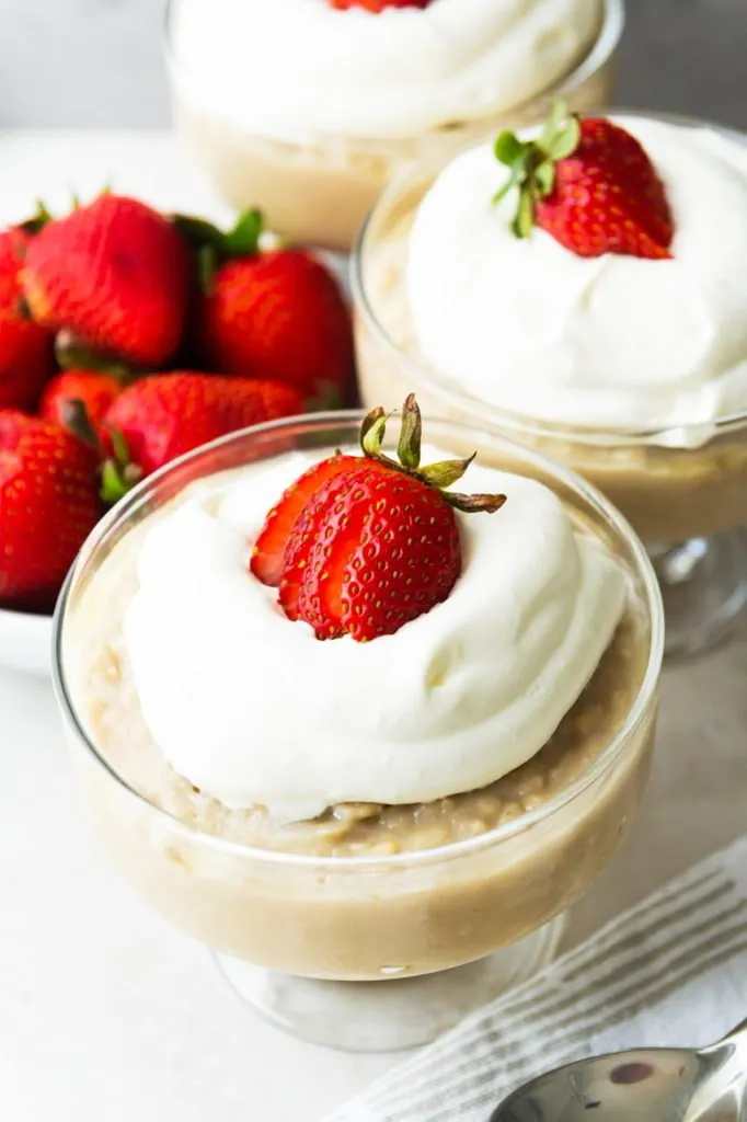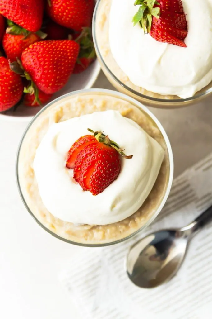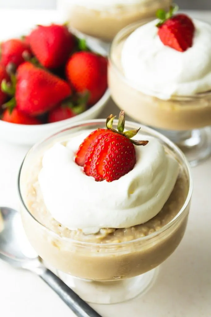 This pudding can be eaten warm but I feel is best chilled a bit and topped with vegan whipped cream. I used pudding style glass dishes for this but any small bowl or glass will work. Mason jars would be great as well.