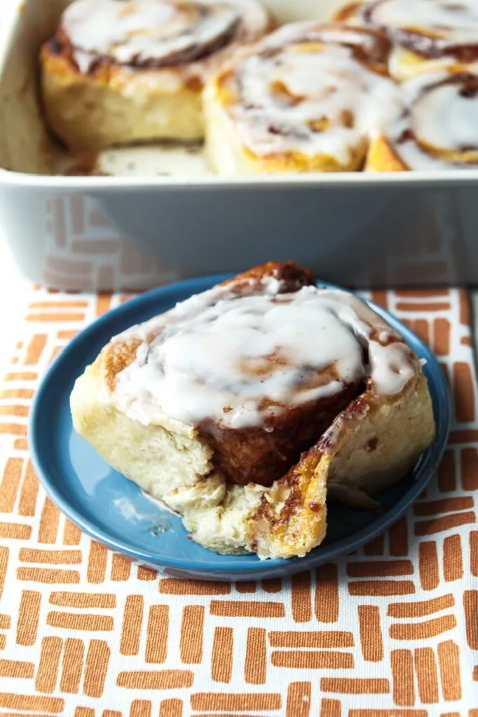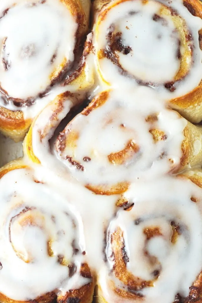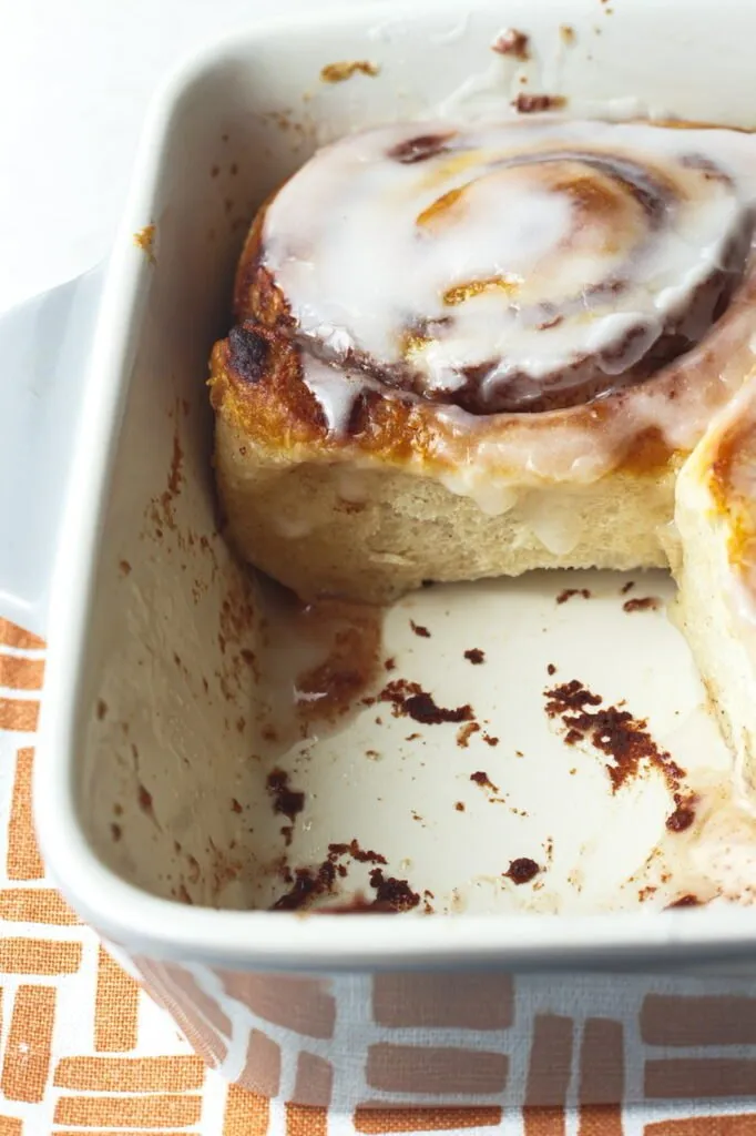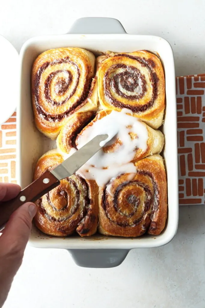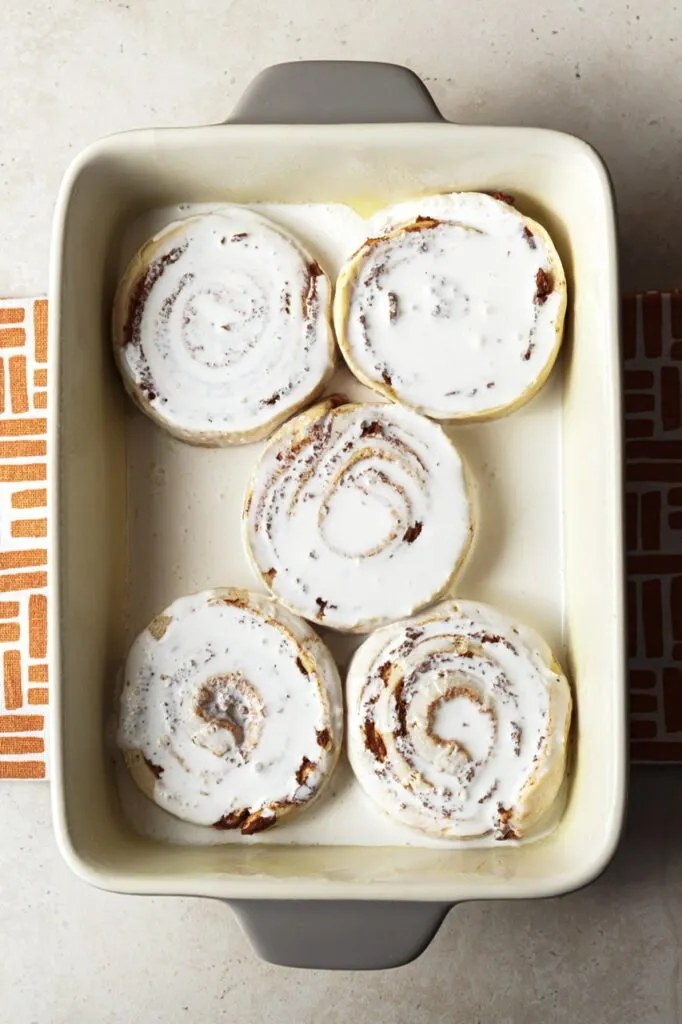After baking, these need to cool for a bit before being iced and any residual cream should get sucked up into the rolls so if you see some pooled after taking them out of the oven, don’t worry.