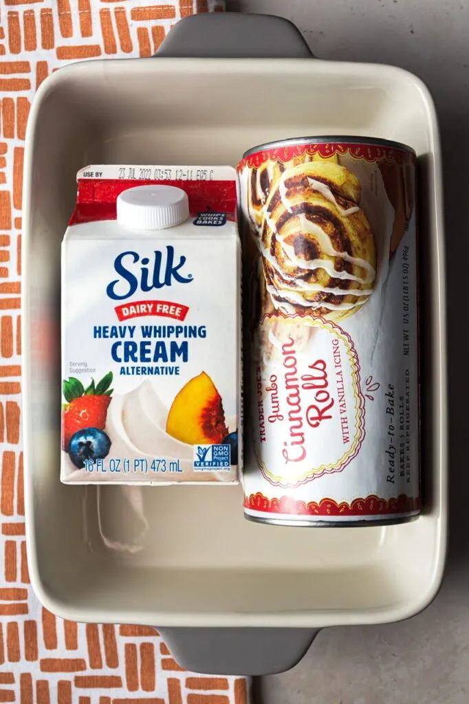 All you need is some vegan heavy cream and a can (or two) of vegan friendly cinnamon rolls. I used Silk brand heavy cream and Trader Joe’s cinnamon rolls but Country Crock now makes a plant cream and Flora also makes a vegan heavy cream. You could use full fat coconut milk but just know it will lend a coconut flavor to the rolls which I actually would probably enjoy but some may not.