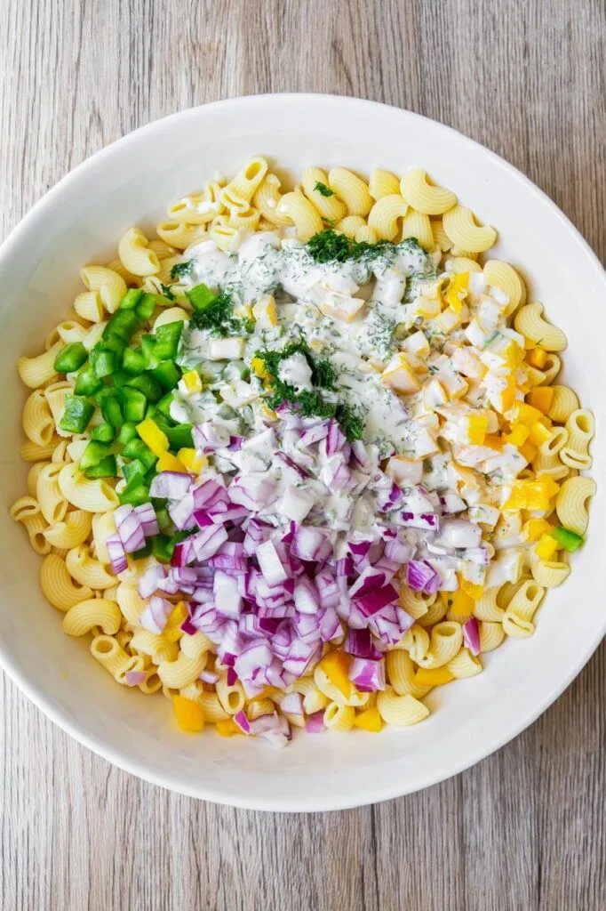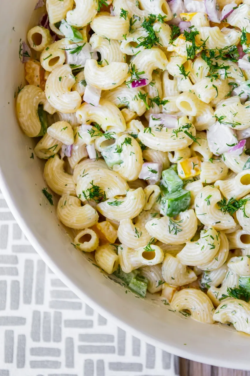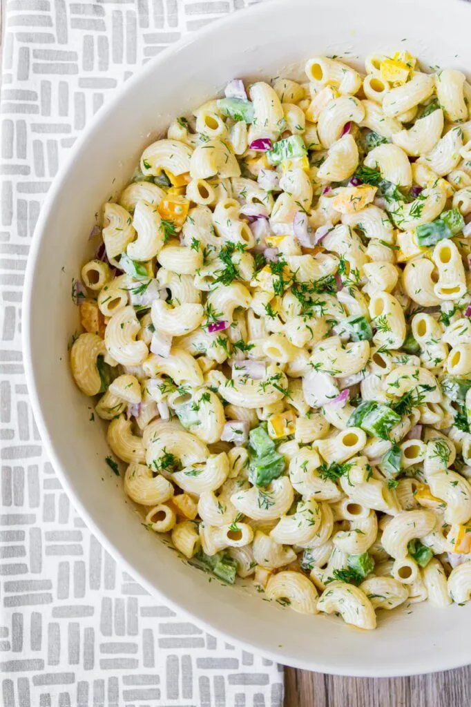 Some call this type of macaroni salad “confetti” salad because of the colorful veggies and I can see that. I used a combo of green and yellow bell peppers, red onion and fresh bright green dill. Certainly looks like a party!