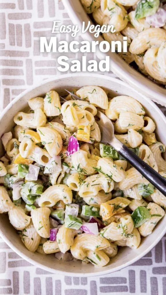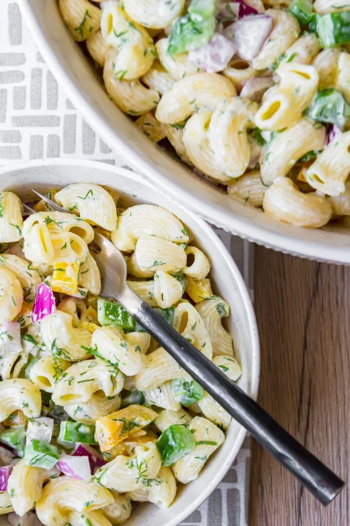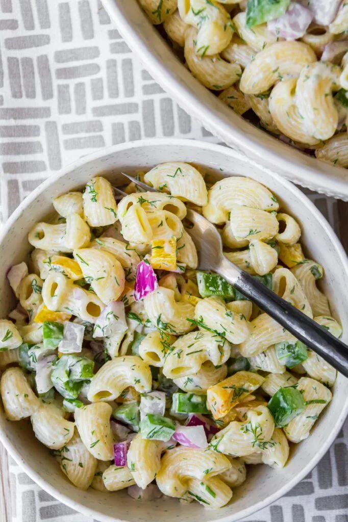 What makes this recipe super easy is that the dressing is equal parts vegan mayo and your favorite vegan ranch dressing. Make my amazing vegan ranch here! Then, it’s just boiling some macaroni, chilling it down, then adding chopped peppers, onions and some fresh dill. You may need a little salt and pepper to taste but that’s it really. Super simple and crazy delicious.