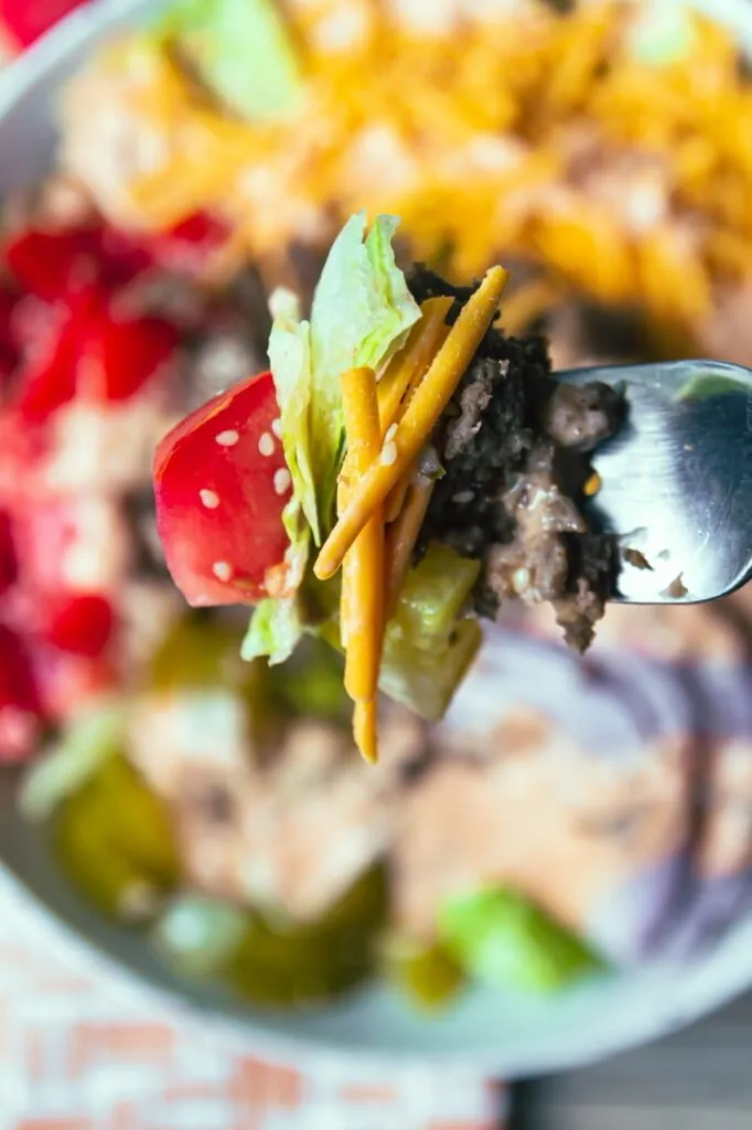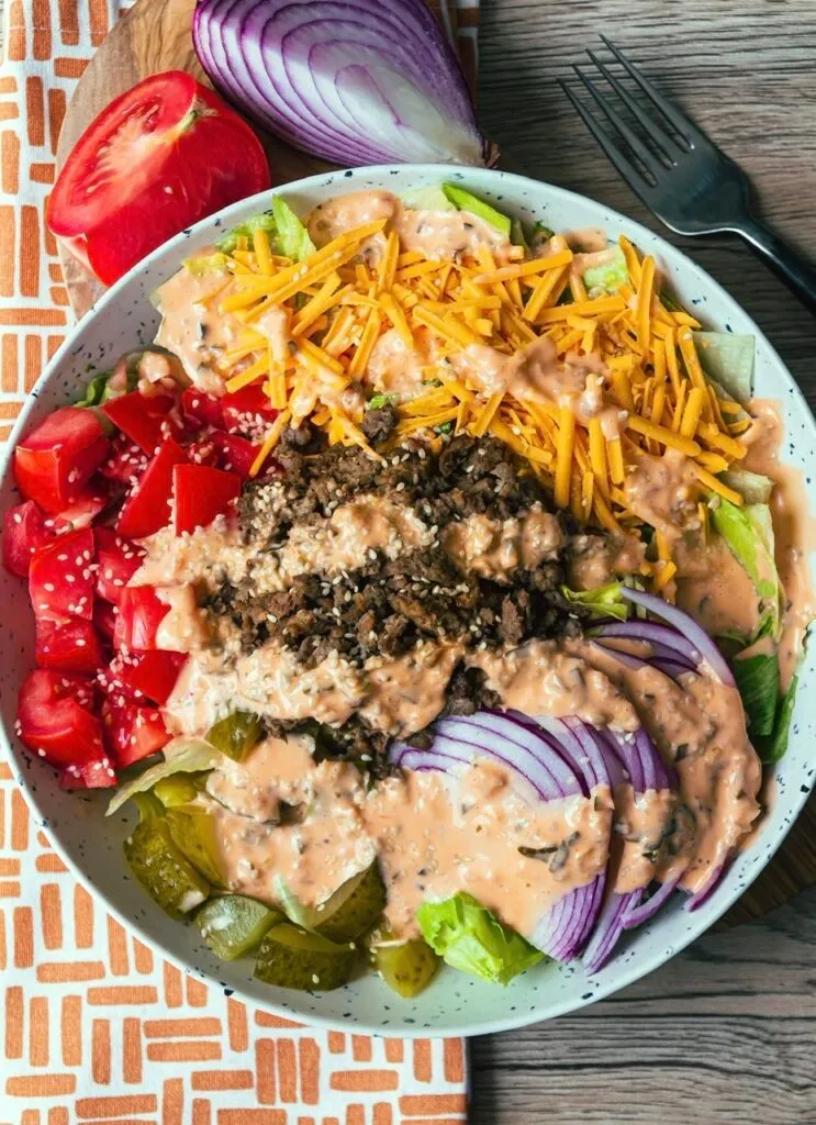 While this is amazing on a vegan burger (remember the jingle “two all beef patties, special sauce, lettuce, cheese, pickles, onions on a sesame seed bun”? No? Probably a millennial…) I wanted a lighter option for summer like a salad. This skips the bun and we’re using vegan burgers. It’s actually accidentally keto and gluten-free to boot!