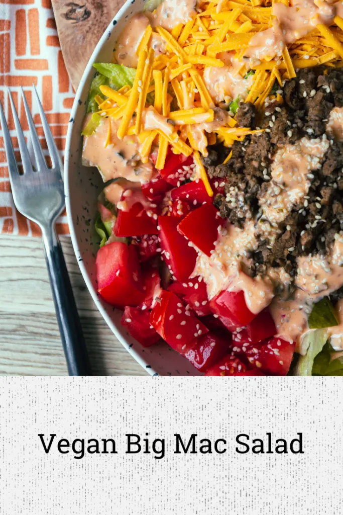 Use your favorite vegan burger (even cooked lentils would work too!) then it’s just assembling the other mentioned ingredients included in a Big Mac (minus the bun) and adding a sprinkling of sesame seeds on top! Super easy and super delicious! This would feed two comfortably but you can always double the dressing and make a large version to feed a crowd. Enjoy!