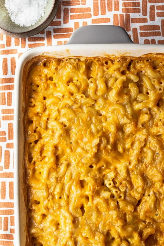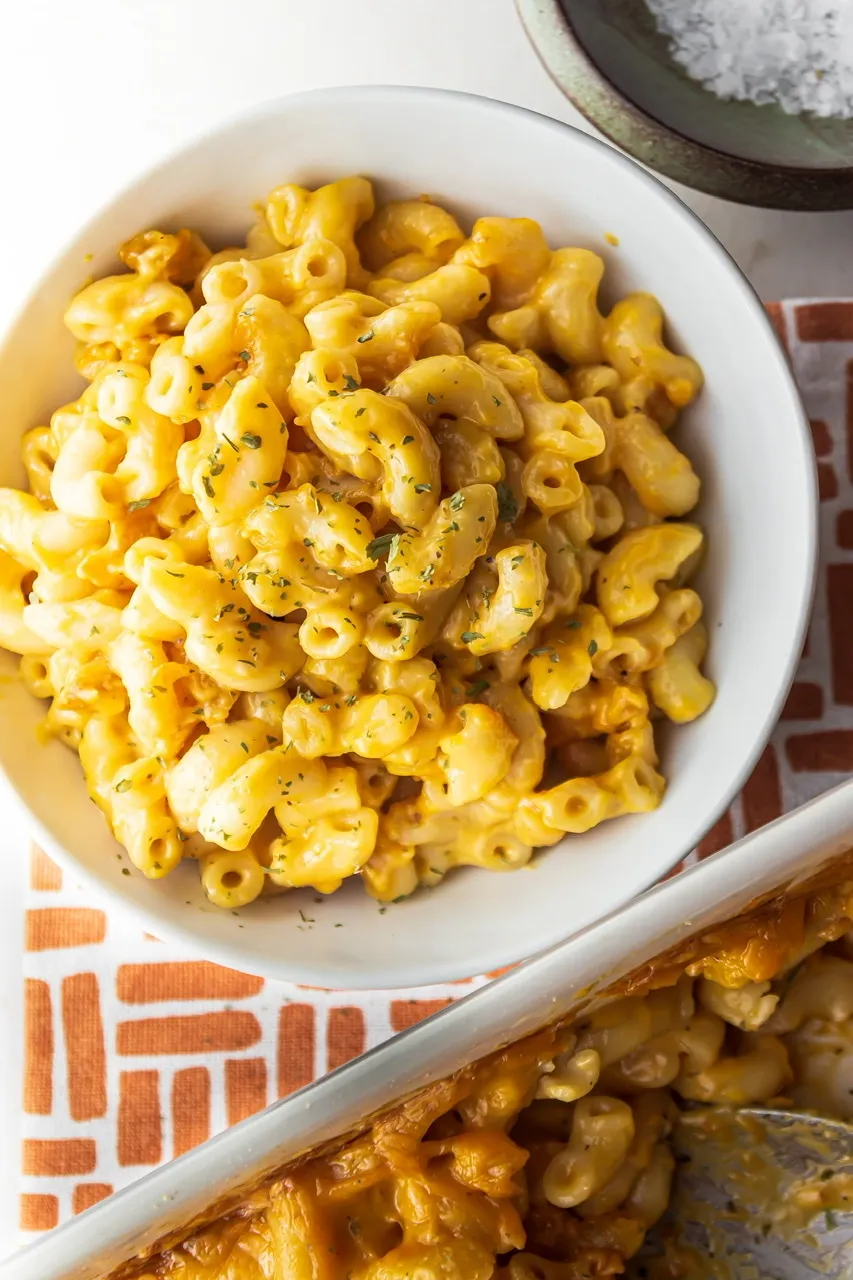All you do is parboil the macaroni, add it to a baking dish with the vegan half and half, some mustard and vegan butter then a whole pack of vegan cheddar shreds. You just stir three times while baking and that’s it! It’s super creamy, easy and tasty to make when you just don’t want to stand over the stove and stir a cheese sauce.