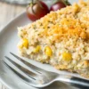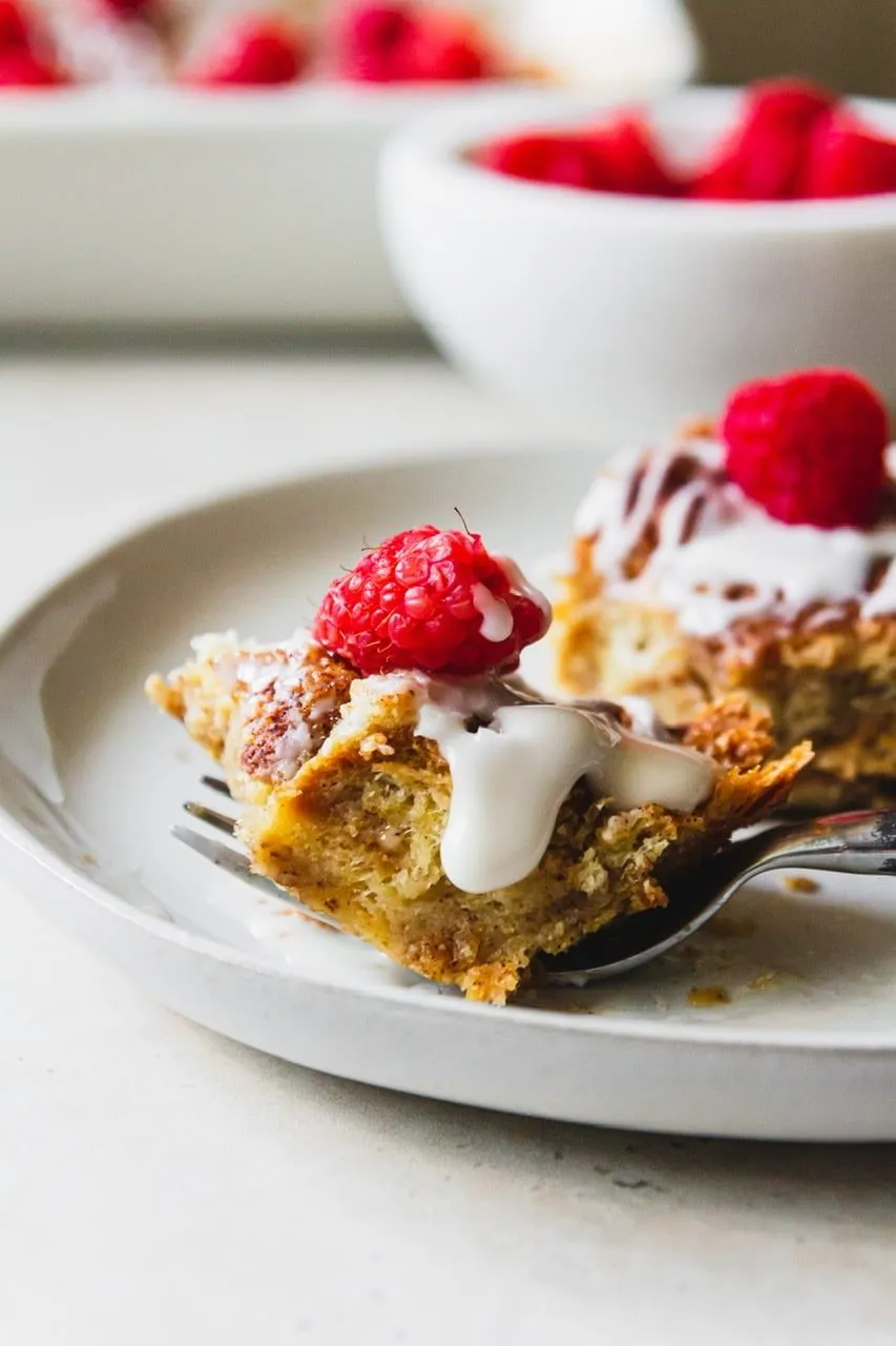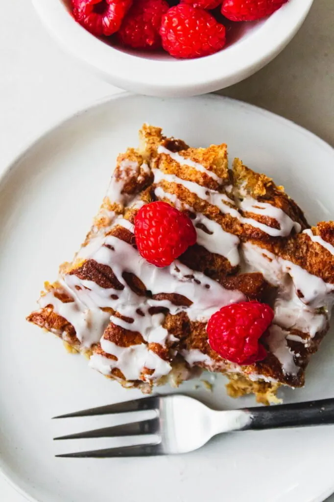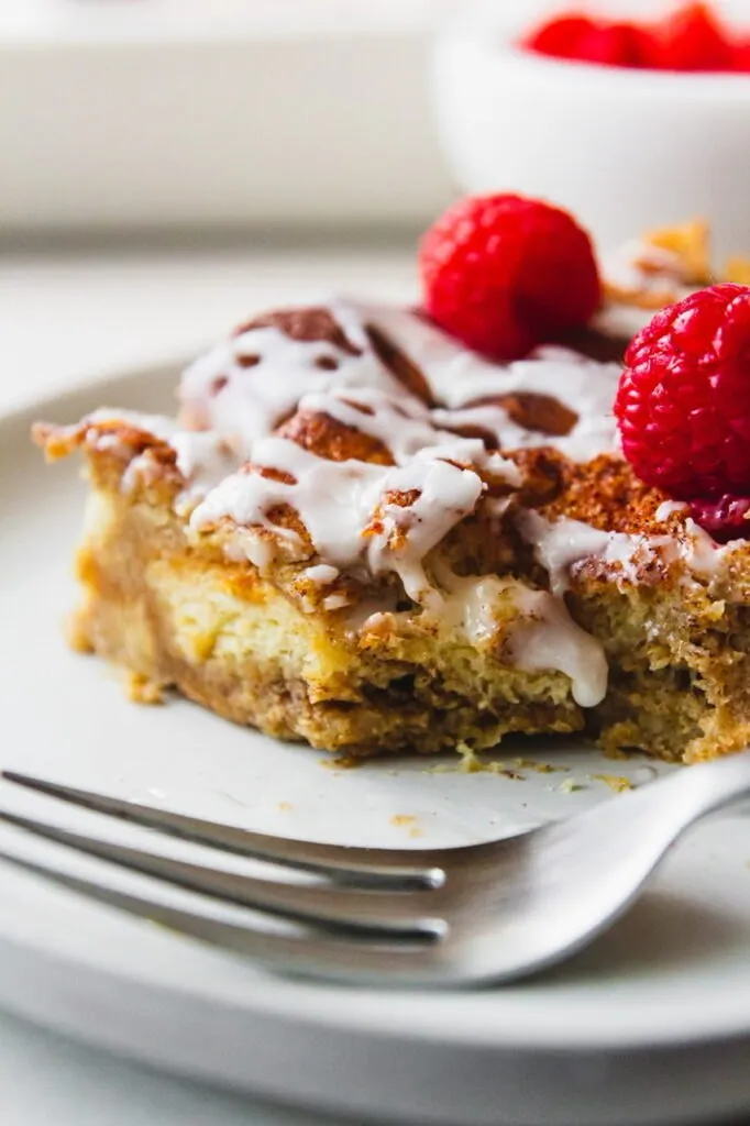 This casserole is great as is with some maple syrup and powdered sugar on top but even better with a drizzle of an easy glaze and fresh fruit (I chose raspberries) so it’s up to you. You can make this in a square or oblong baking dish. I used a 9×13 but it will be thicker in a 9×9 pan and may just have to cook a little longer.