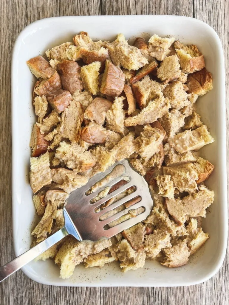 I’m not a huge fan of normal French toast. I know, blasphemy. It takes forever to make and by the time a few slices are done, the others are cold and then the butter doesn’t melt and the syrup makes it colder. I thought about making brioche French toast with the new Trader Joe’s bread but then thought maybe a casserole might work better? I knew I would be using Just Egg (the vegan liquid egg substitute) but thought this will have all the flavor but be easier to make and ready for everyone at the same time!