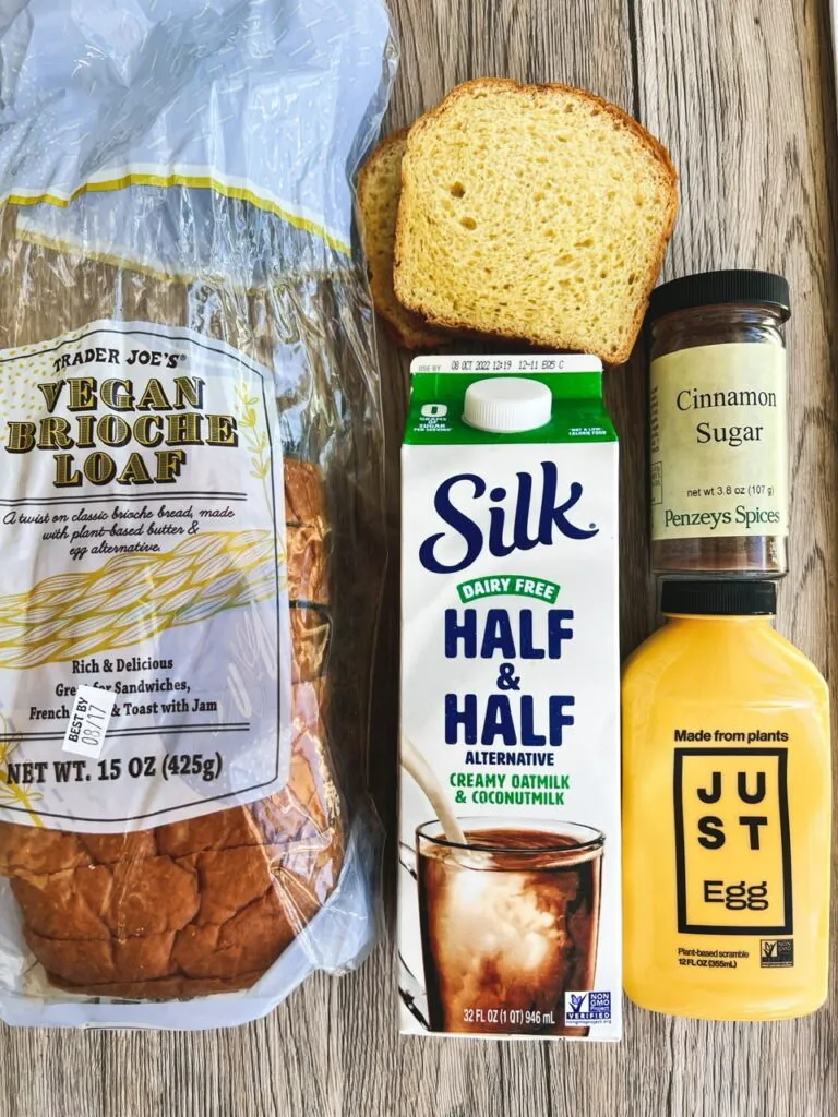So you’ll need vegan brioche. You could use French bread and that will taste fine but the brioche makes it extra special. As I mentioned, Trader Joe’s sells it now and there’s also La Boulangerie brand from San Francisco which can be found at some Whole Foods Market stores and can be ordered online and Sprouts Market makes a loaf as well. Then you’ll need the Just Egg, some vegan half and half, maple syrup and cinnamon sugar.