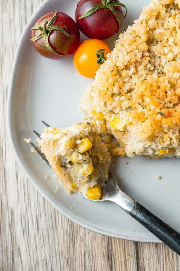 This baked pie should set a bit before slicing and I prefer to actually make it the day before I’ll be serving it and then heat it up. This pie is sweet, savory, a little crunchy and totally addictive if you’re a corn lover and if you’re not, we can’t be friends. I hope you try this pie as it’s the best of summer on a plate. Served with a tasty tomato salad it’s the perfect meal!