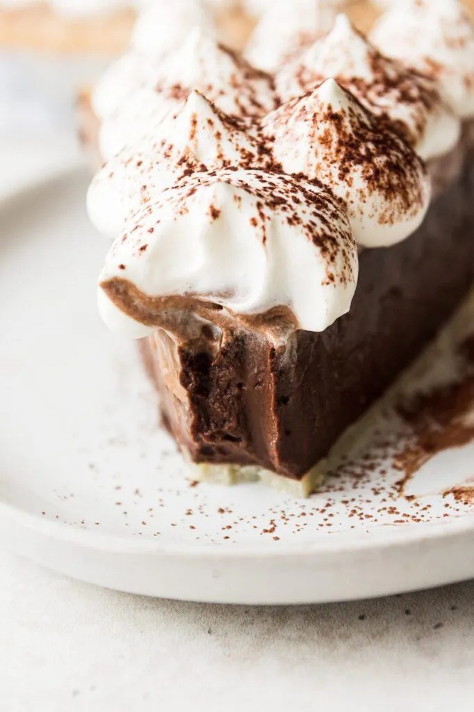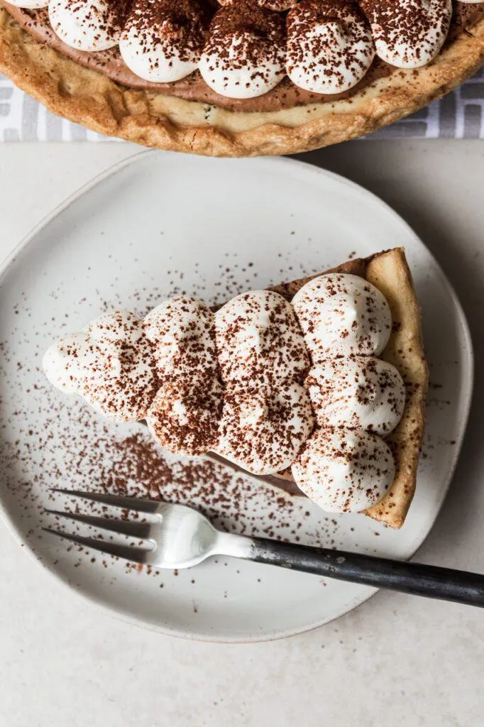 I’ve made this in a traditional pie crust but you could use a graham cracker or chocolate cookie no bake crust as well. I like the old time diner style of a regular pie crust but making your own can be daunting. I used a premade vegan store pie crust and baked it blind (that means poking holes in the bottom of the crust before baking and adding a piece of foil then dried beans that help it keep it’s shape while baking. They also sell pie weights in stores but they’re pricey and beans work just fine. I think I’ve had the same bag of beans for about 15 years that I just keep reusing for this purpose.