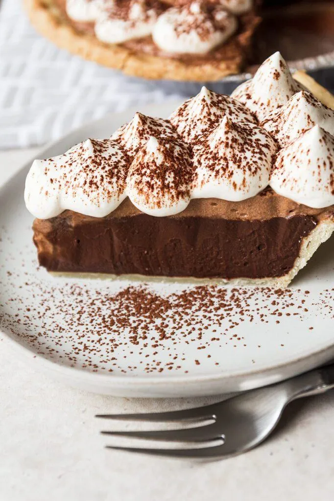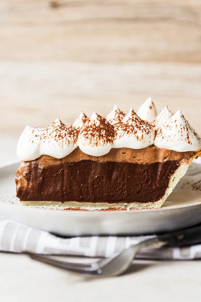This is a special chocolate cream pie. Not only does it have a deep dark chocolate pudding layer, it has a light whipped ganache layer on top (trust me, it’s easy) and dollops of whipped cream and is heaven in every bite.