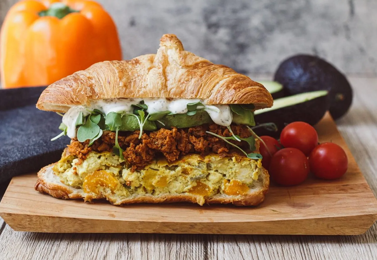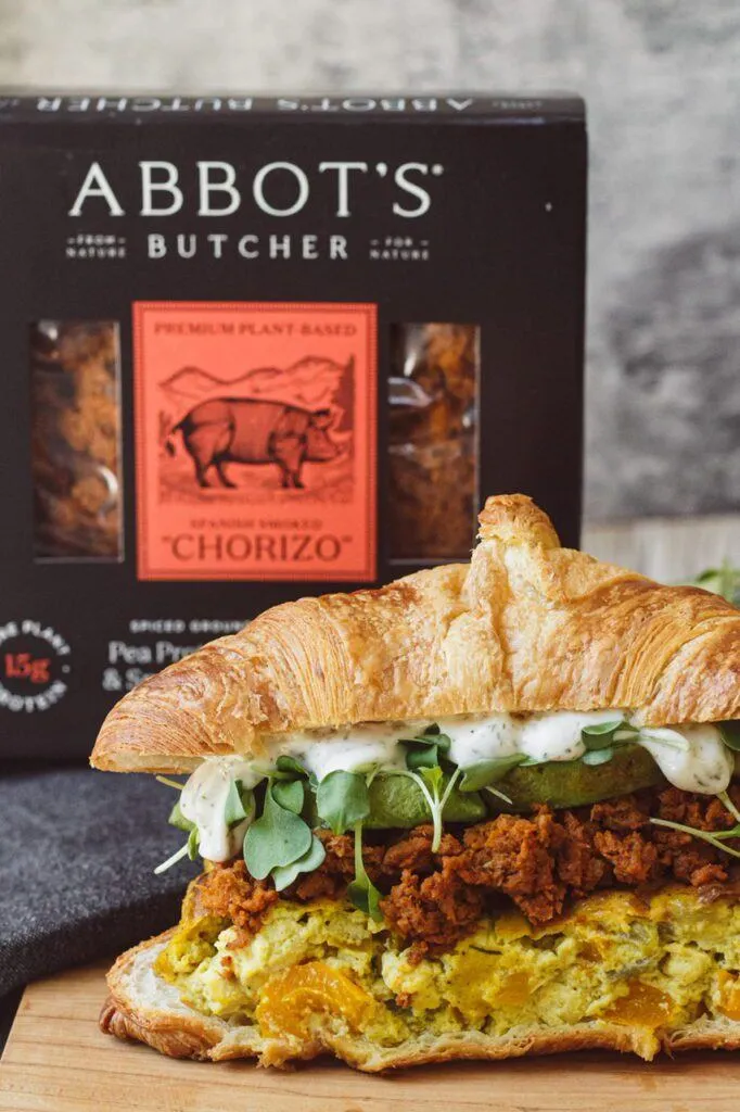 It’s national croissant day (but these are vegan!). I originally developed this recipe for Abbot’s Butcher with their delicious chorizo and am now sharing with you! It’s layered with eggy tofu, smoky “Chorizo,” creamy avocado, and crisp greens between two flaky croissant halves and such a delicious sandwich or breakfast, brunch or anytime.