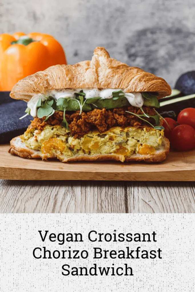 The eggy tofu layer is so tasty on its own but when added to a croissant with chorizo and toppings, it elevates it to another level. It’s pretty simple to make and with store bought croissants or even vegan brioche bread, this comes together quickly.