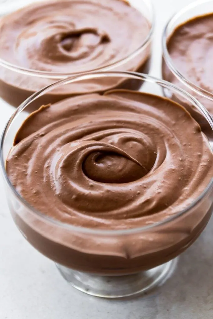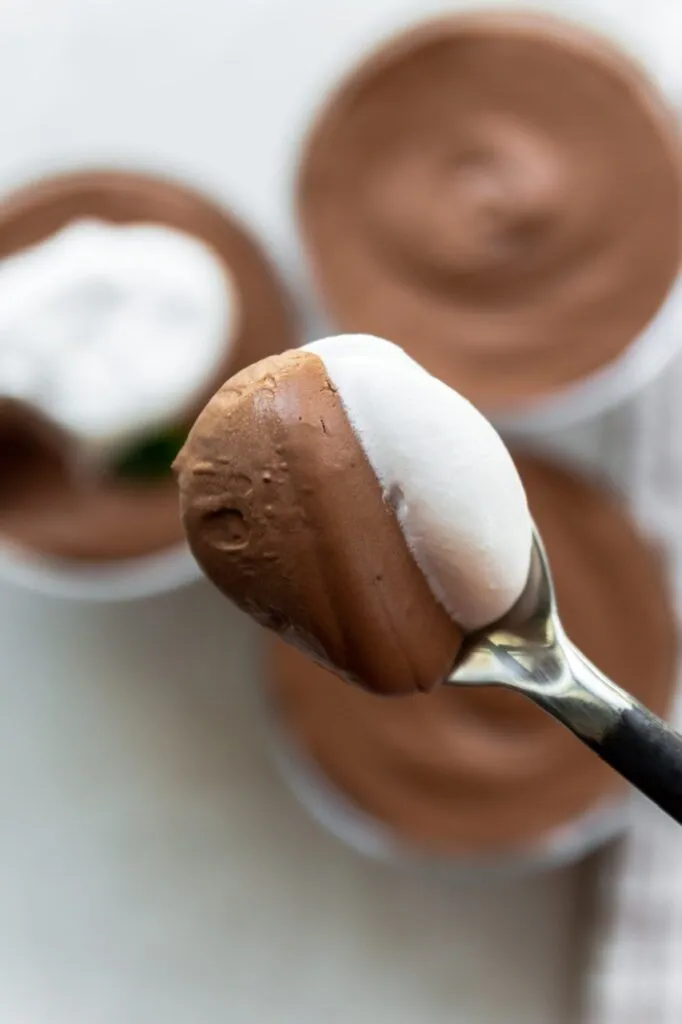 Traditional chocolate mousse relies on eggs (yolks and whites) for its texture but that’s hard to replicate vegan. Using aquafaba can work and I’ve tried it but it tasted flat to me and not rich enough. I found using vegan heavy cream (there are quite a few brands now: Country Crock plant cream, Violife cream, Califia cream and Silk whipping cream) and good quality chocolate worked great for a rich decadent dessert. While it lacks the signature air bubbles in a traditional mousse, when set, it does have the same texture.