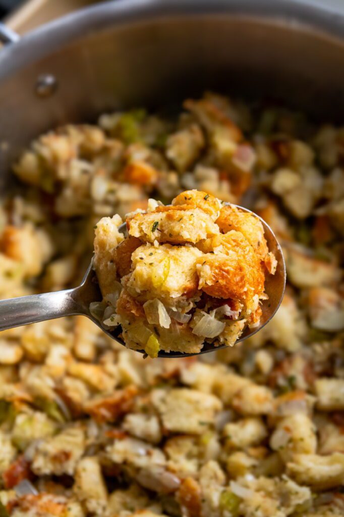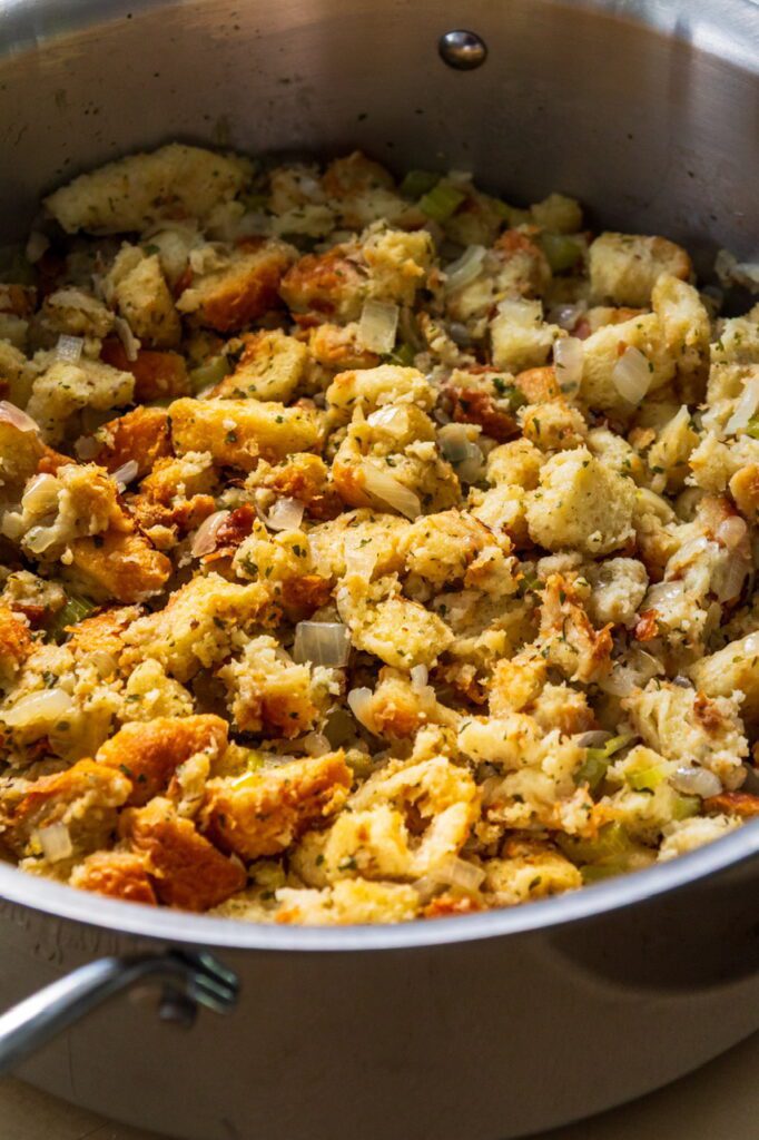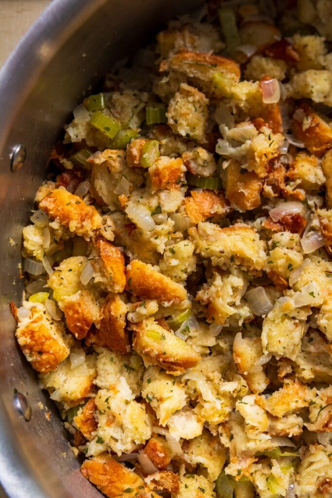 • Add broth gradually. Stop when it’s moist but not soggy as too much broth leads to mushy stuffing.