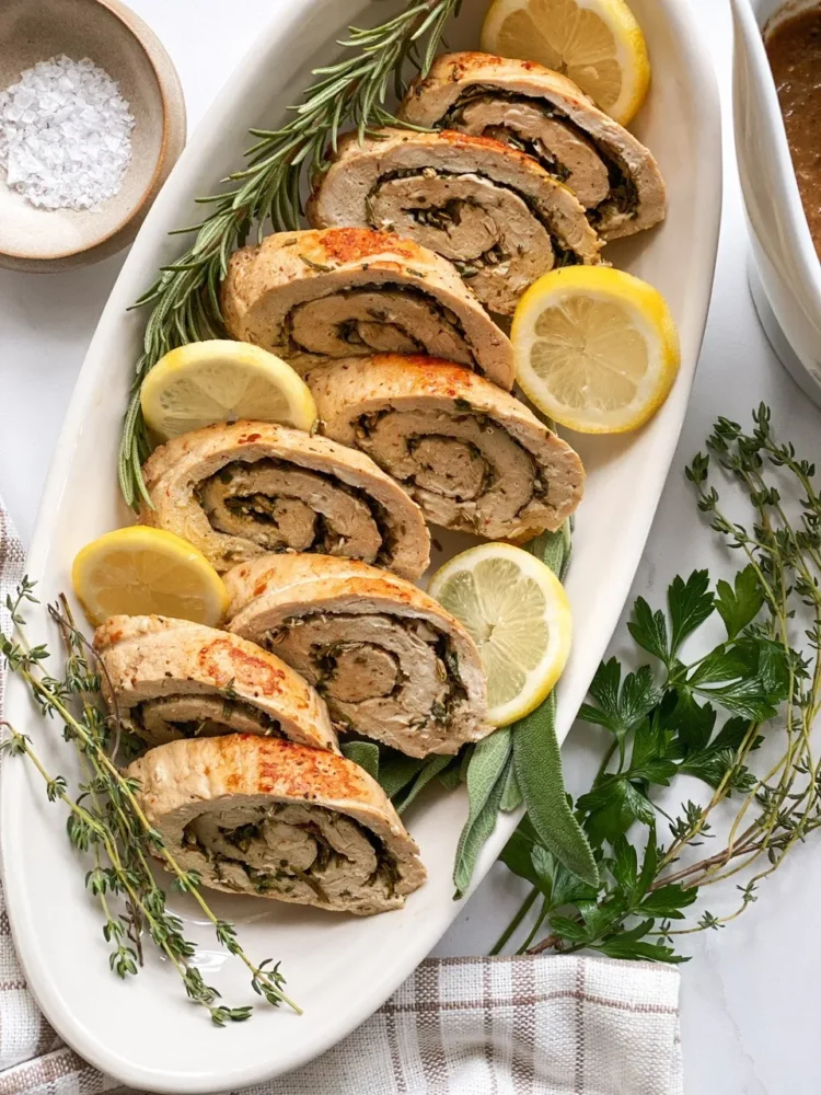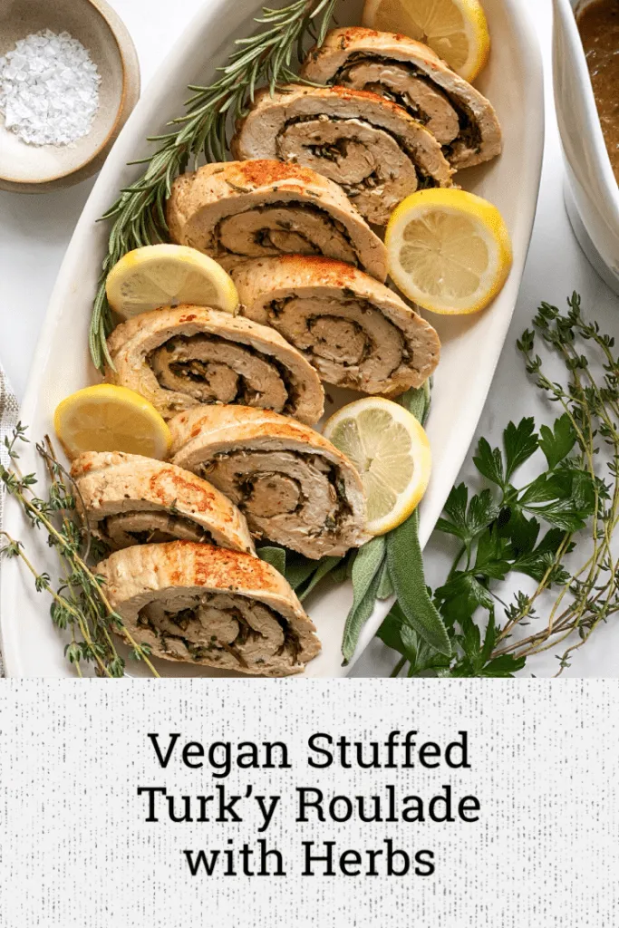 I served this on a platter with fresh herbs and lemons as a garnish but this is great with vegan gravy or a wine butter sauce. I hope you try this relatively easy holiday centerpiece and wow even your non-vegan guests!