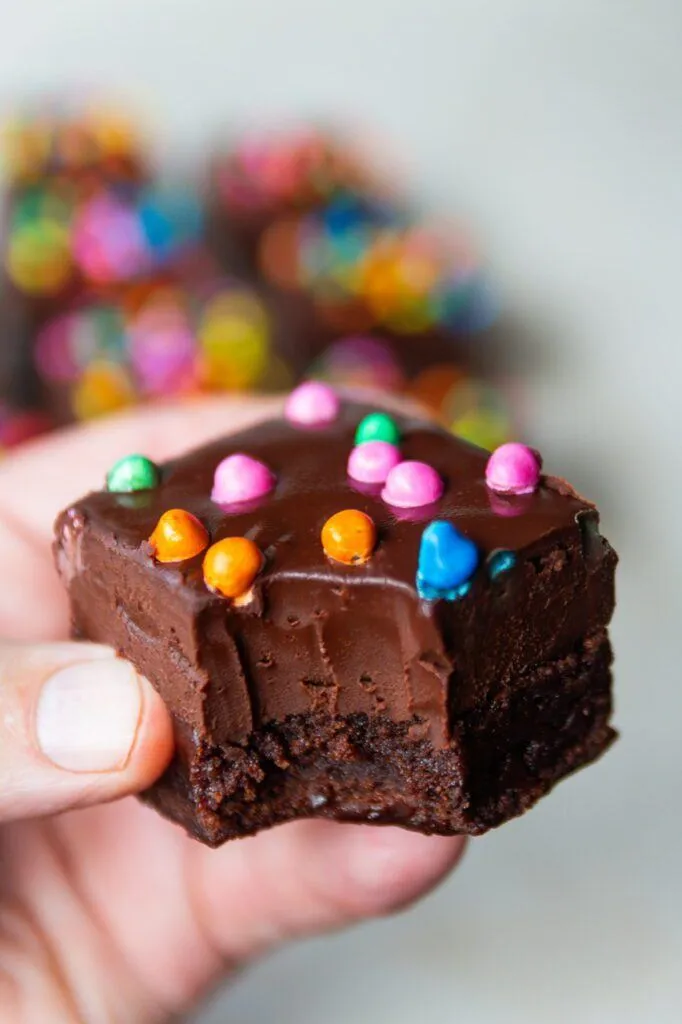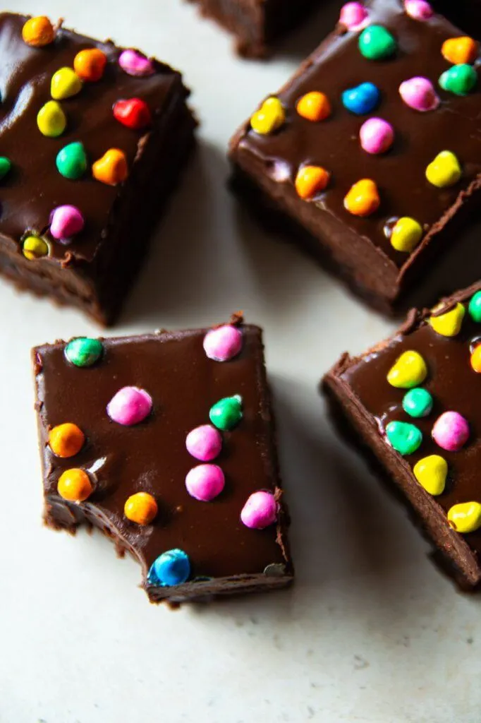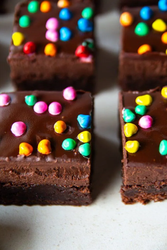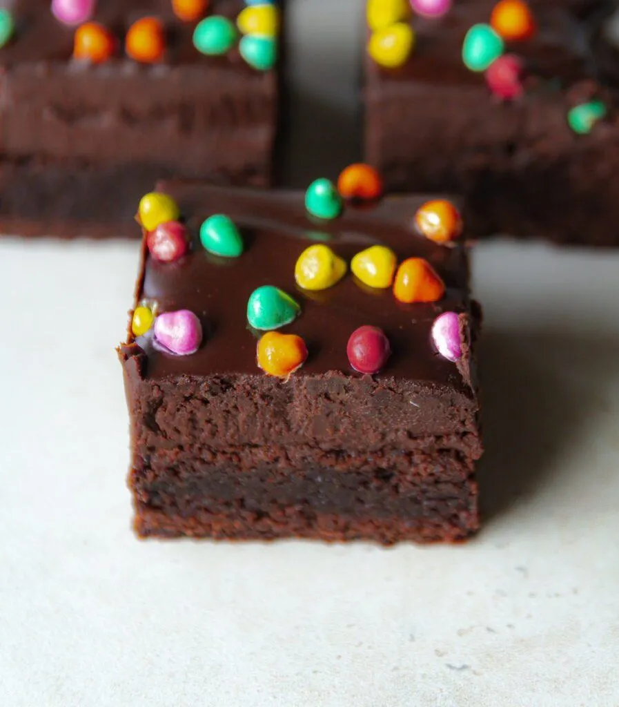 I didn’t realize this, but the cosmic candy sprinkles are the same as I used to have in my childhood, and are Vegan! They were the perfect addition to these perfect brownies!
