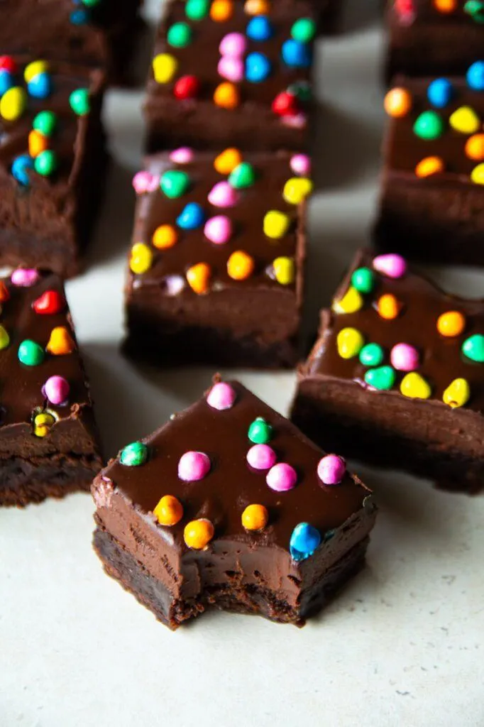 The brownies consist of a brownie layer of course, a layer of frosting then the aforementioned candies sprinkled on top. I do have a delicious brownie recipe on my blog but wanted to make this easy so my better boxed brownies recipe came to the rescue! This is my blog breaking way to make vegan brownies from a boxed mix that don’t dissolve into a puddle of lava. There’s nothing shocking in them but it’s the exact measurements of the ingredients that make all the difference.