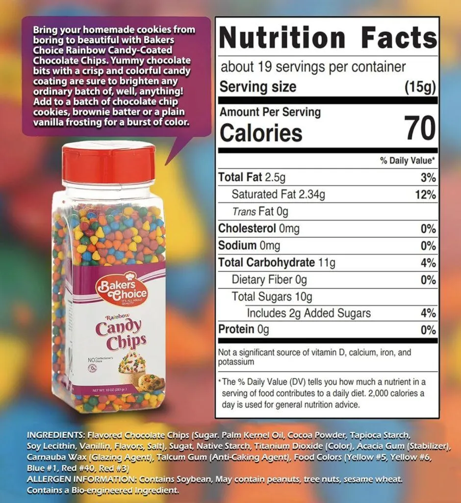 These are the vegan friendly Bakers Choice rainbow candy chips I used (no confectioners glaze, gelatin or milk but they do contain artificial colors so avoid if concerned). You can find them in my Amazon store here. They are also kosher pareve which is an indicator that no meat or dairy products were used. They could still contain fish or eggs but those are in the top 8 major allergens and would need to be disclosed.