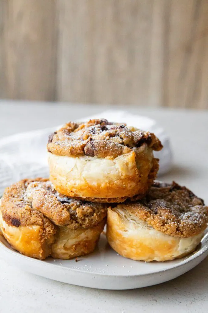 Cruffins are a delightful pastry innovation that blends the texture of a muffin with the flavors of a croissant. When you add the cookie element into the mix, you get a cruffin that has a crumbly, cookie-like top and a soft, fluffy interior. This vegan version omits any animal products but still delivers on taste and texture.