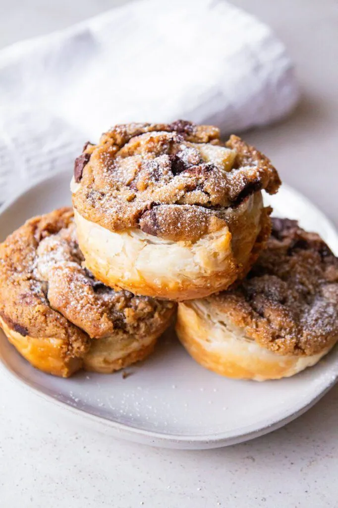 You need to let the puff pastry thaw in the fridge for a few hours before you can use it so it’s pliable. You just spread the cookie dough over the puff pastry to the edges then cut and roll them up like cinnamon rolls and place in greased muffin tins. You can even top them with more cookie dough on top to really make them over the top and then sprinkle with powdered sugar before serving!