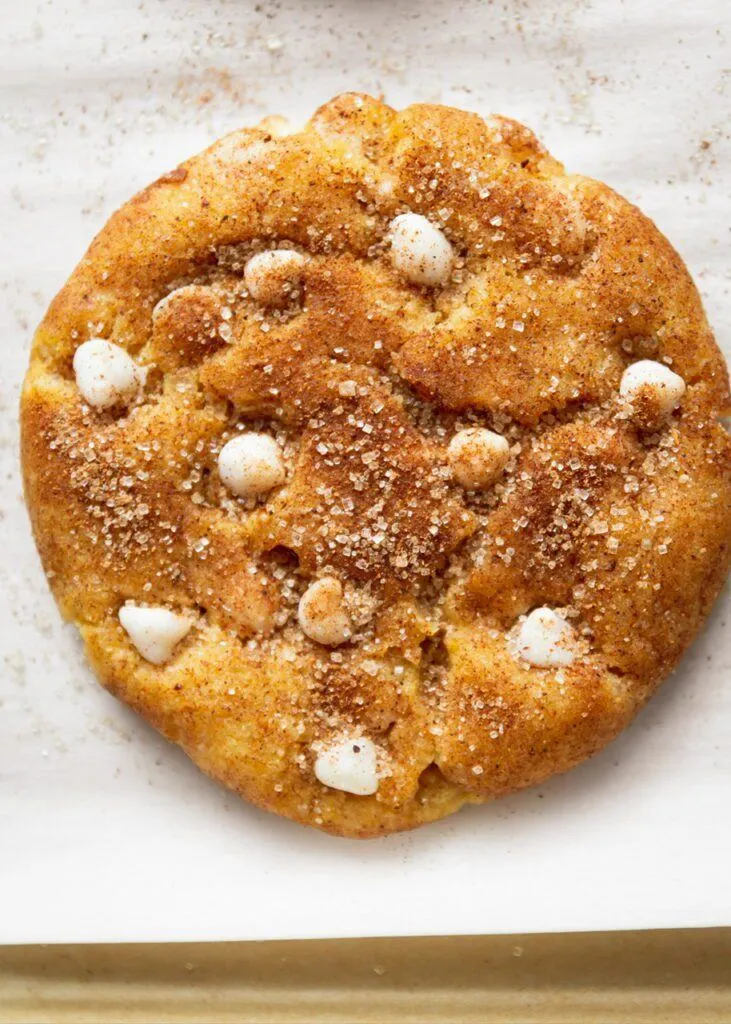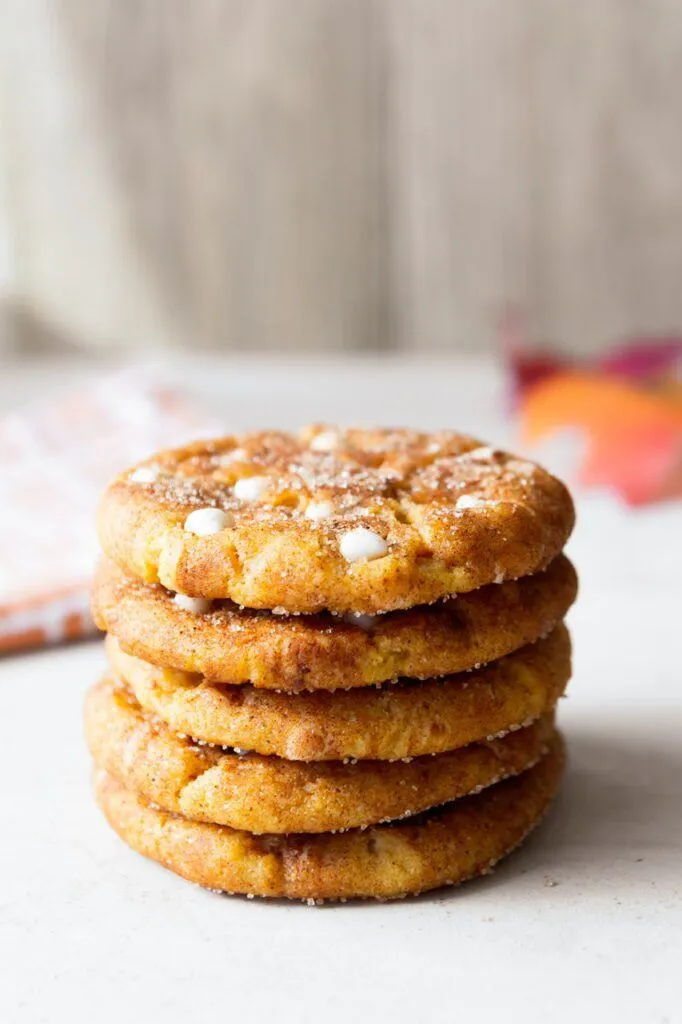 Snickerdoodle cookies are a classic American cookie that are soft, pillowy and chewy with a coating of cinnamon sugar and although not the most show stopping of cookies, are a favorite amongst cookie lovers. For fall, I decided to update my delicious vegan version with warm notes of pumpkin spice and white chocolate chips for a chewy version of this fan favorite!
