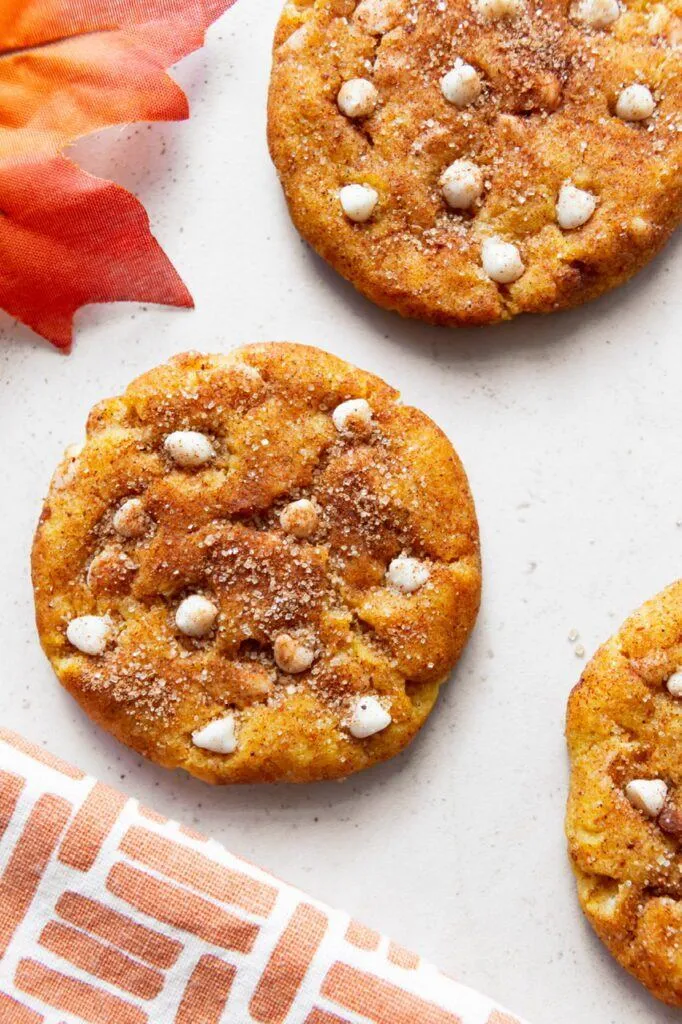 - Pumpkin spice! I add pumpkin spice seasoning to the dough and more to the sugar mixture that coats the cookies to amp up the flavor.