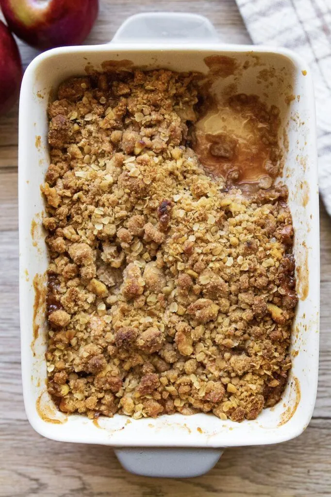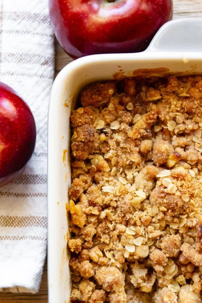 An apple crisp topping includes oats as well as flour, whereas a “crumble” topping is made with flour but no oats. An apple crumble tends to have a more clumpy topping than a crisp and doesn’t normally include oats or nuts. A ” Brown Betty” is also similar and a variant on the crisp, but are typically made with alternating layers of fruit with spices and buttered bread crumbs. Having said that, one region’s crisp is another region’s crumble, so don’t judge the recipe by name alone. I’m adding both nuts and dried fruit to my oat topping which I feel adds both crunchy and chewy textures which I enjoy but they’re optional additions.