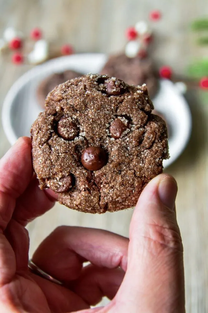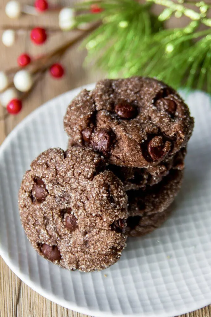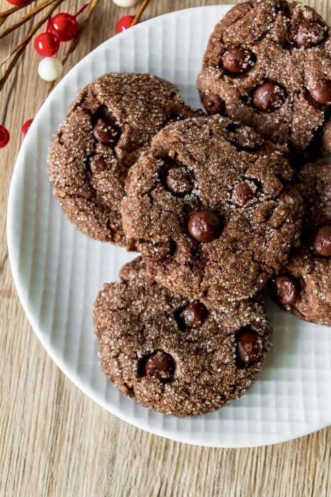I used only 1/2 c chocolate chips and added 1/2 cup Dandies marshmallows to make them a peppermint hot chocolate cookie. I also didn’t roll in sugar, instead topping with crushed candy canes. They came out perfect.