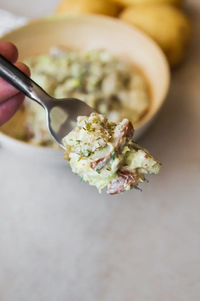 - Salt and fresh dill – simple seasonings pull it all together but potatoes need a lot of salt so we’re going to make sure the water is seasoned as well as the final dish. Fresh dill is a classic addition but you could use another herb like parsley or even chives. Fresh is best but you could use dried as well.