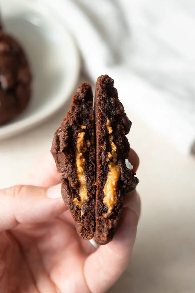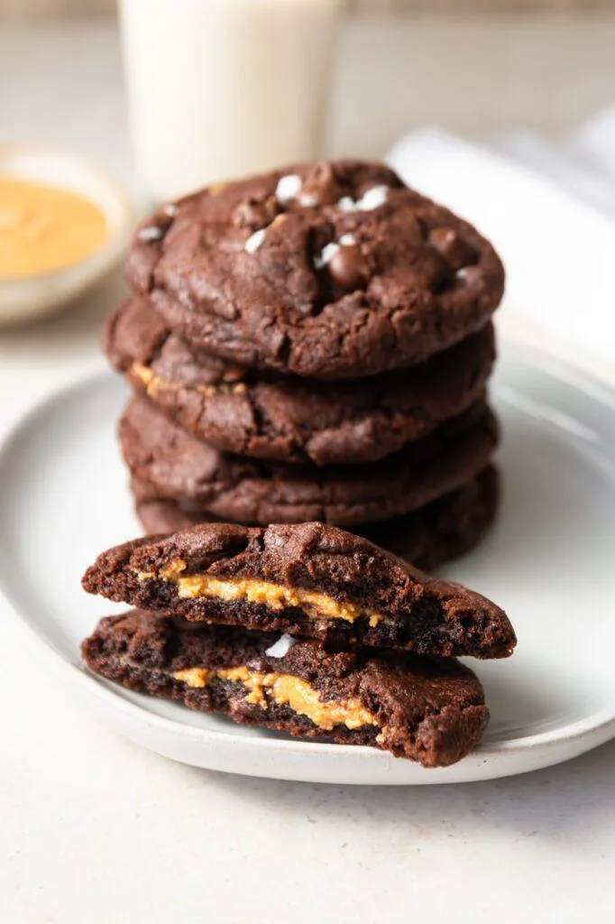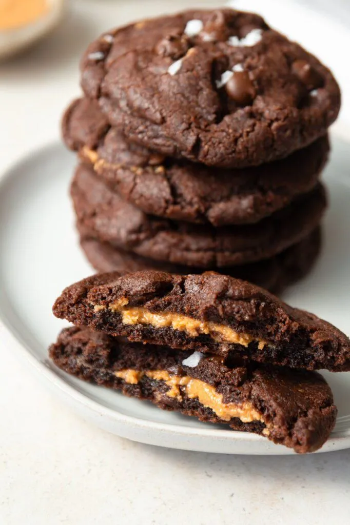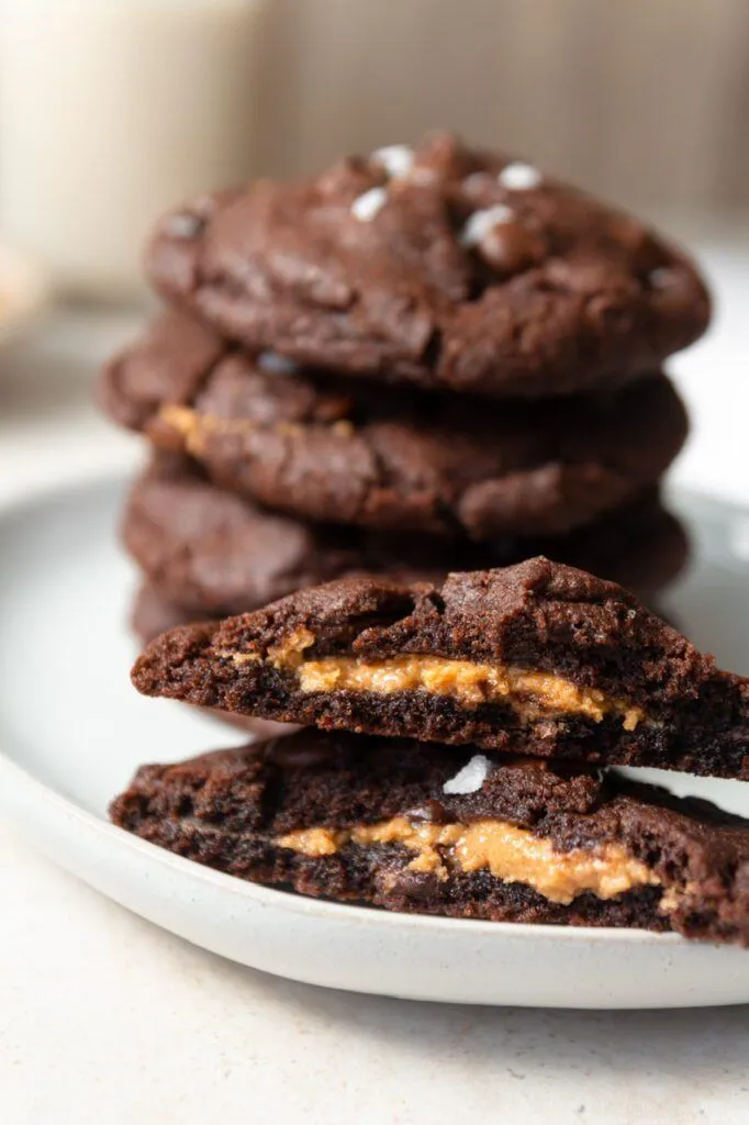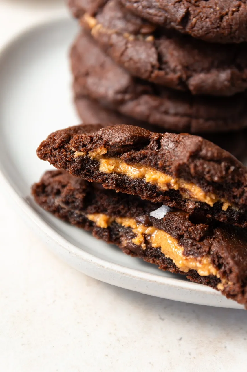 These Double Chocolate Peanut Butter Core Cookies are fudgy on the outside, creamy in the middle, and completely vegan. Basically, a peanut butter cup and a brownie had a cookie baby. You probably have most of the ingredients on hand and can whip these up when the mood strikes. If you’re a peanut butter and chocolate fan like me then read on!