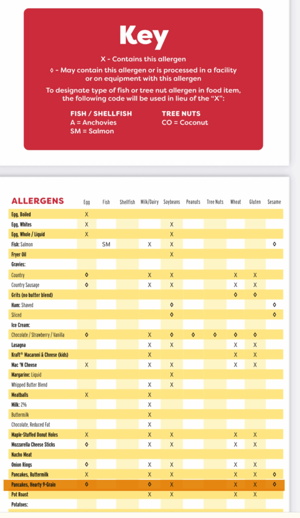 On the menu, they’re listed as a “hearty 9-grain pancake slam” and pictured with sausages and eggs but underneath, but it says you can make it “plant-based” when paired with hash browns and seasonal fruit as the side choices. The 9-grain had been a pancake option previously and initially caused confusion as they contained milk and eggs and their allergen statements were not updated initially online after the announce of the new plant-based recipe for them so some thought the new ones weren’t vegan friendly. They could have avoided this by naming them something completely different rather than revising an existing menu item in my opinion. Below is Denny’s updated allergen guide that now lists the 9-grain pancakes as only containing wheat and soy and “may contain” for egg and dairy due to possible cross contamination.