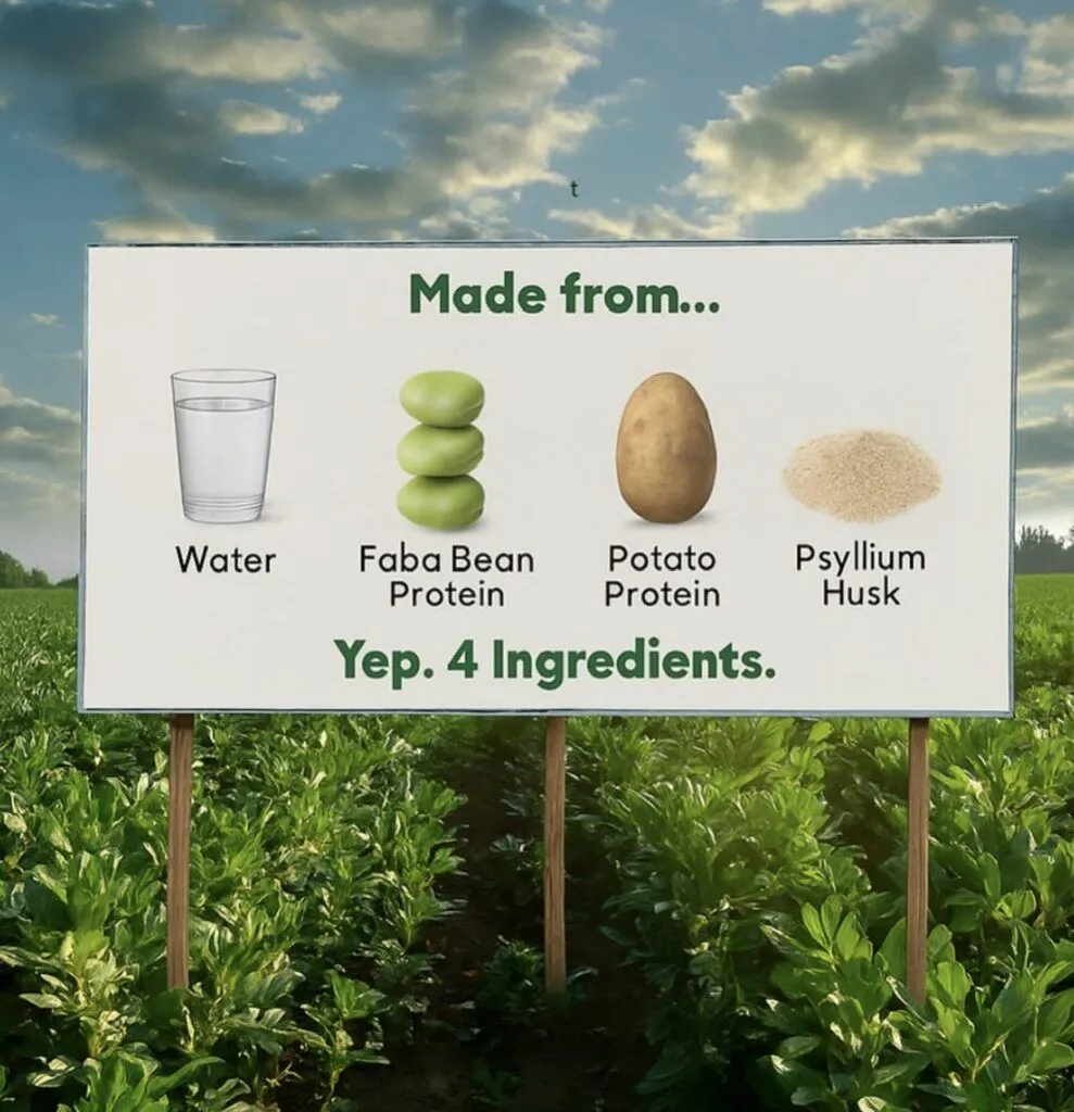 - Focused on simplicity: only four ingredients: water, fava bean protein, potato protein, and psyllium husk fiber.