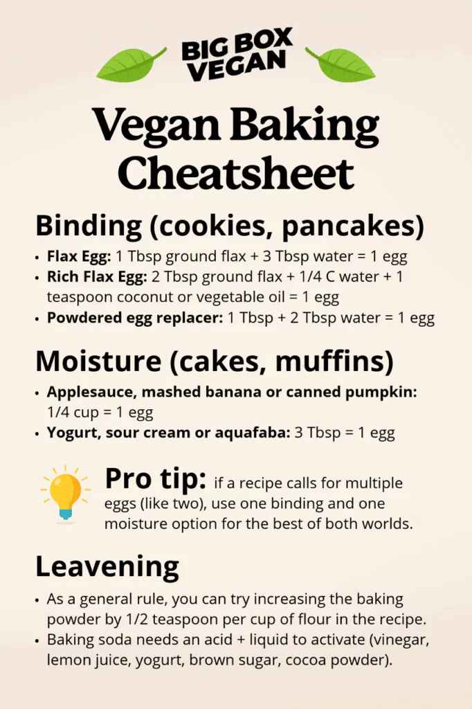Vegan baking is about balance: moisture + structure + lift. Once you know what each ingredient contributes, you’ll be able to swap by making educated decisions.