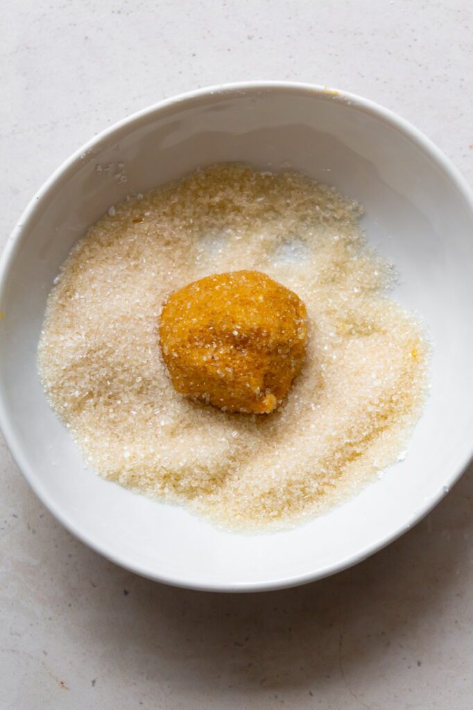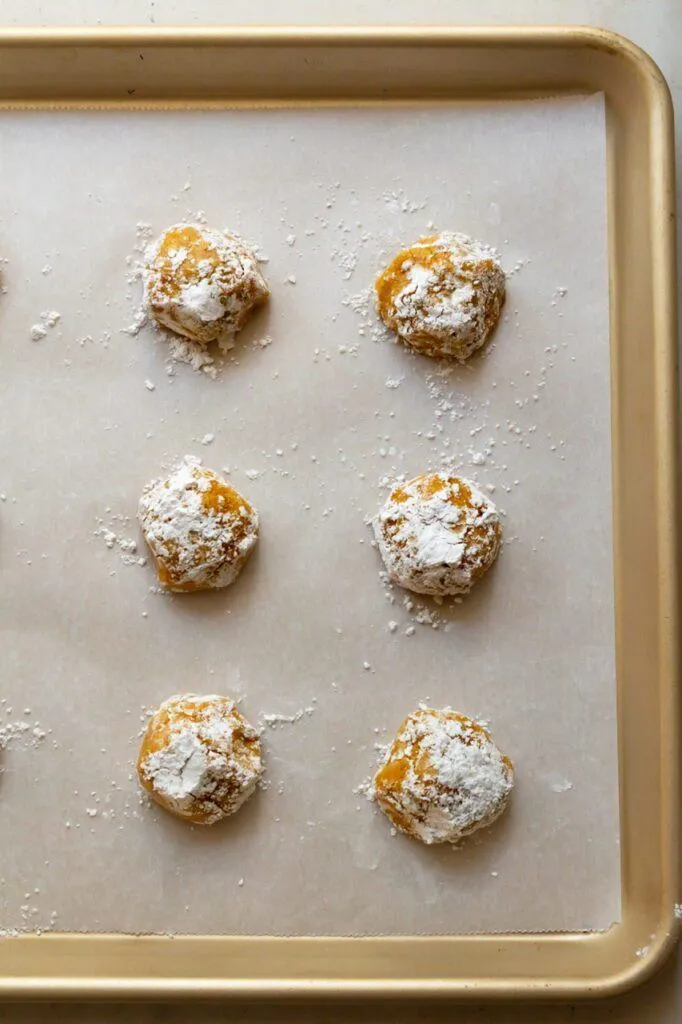 I want to warn you that the batter may seem softer than it should be but it’s correct. Using a small ice cream scoop really helps make it easier to form the before dipping into sugar (two kinds, more about that in a bit). These can be a little fussy to assemble for sure so I suggest placing your bowls on a cookie sheet to catch any sugar spilling over as you coat the dough balls and using a small spoon to move the ball around gently. You can then reform them into more of a circular shape before placing on the baking sheet and place the side with the most confectioners sugar right side up for maximum crackle effect.