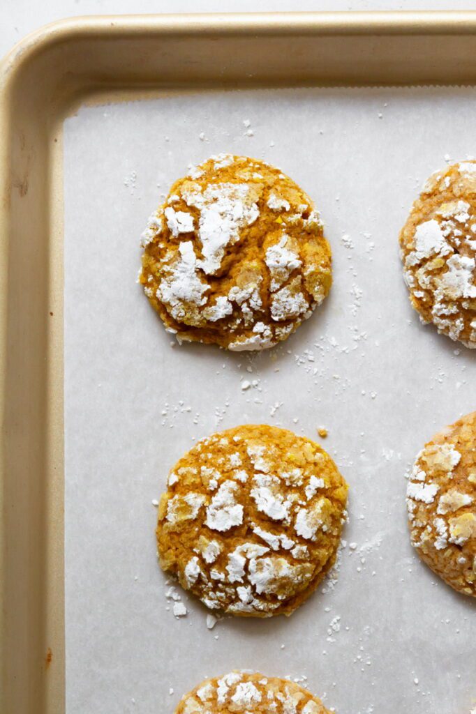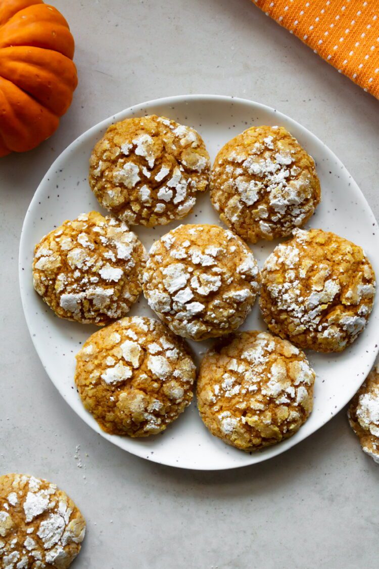 Pumpkin adds a lot of moisture, which is why so many pumpkin cookies bake up too fluffy and cake-like. That’s great if you want muffin tops, but not so much for crinkle cookies. After experimenting with both blotted pumpkin (to remove some moisture) and unblotted pumpkin, I found that using 3/4 cup straight from the can (no blotting!) gave me the texture I was looking for which was a bit chewy, not too cakey, with enough pumpkin flavor to shine through. A little cornstarch helped keeps them soft and tender, and chilling the dough was essential to ensure the crinkles actually pop instead of melting into flat discs.