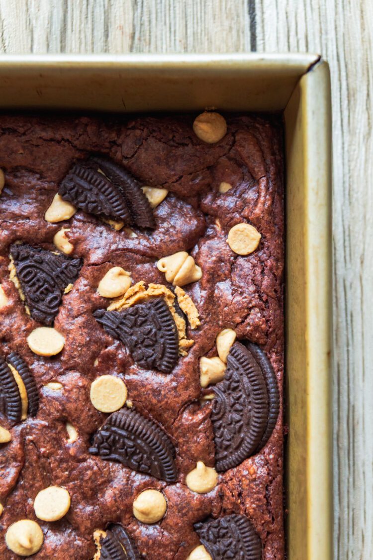 Fudgy vegan brownies made with my Better Boxed method, packed with dairy-free Reese’s peanut butter chips and chunks of Reese’s Peanut Butter Oreos for the ultimate peanut butter chocolate treat.