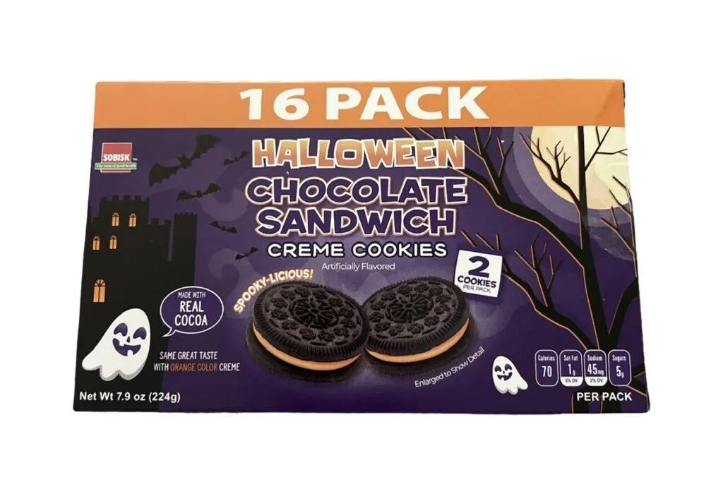 Many store-brands sandwich cookies are vegan friendly just look for pumpkin spice or black and orange designs! Found these Sobisk brand at Dollar Tree and Walmart stores!