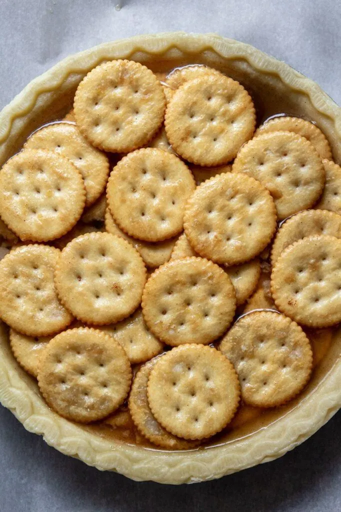 - Using whole layered crackers mimics the stacked shape of apple slices further enhancing the illusion of a real apple pie. Some recipes I’ve read while researching use broken up crackers so you can do that as well if preferred.
