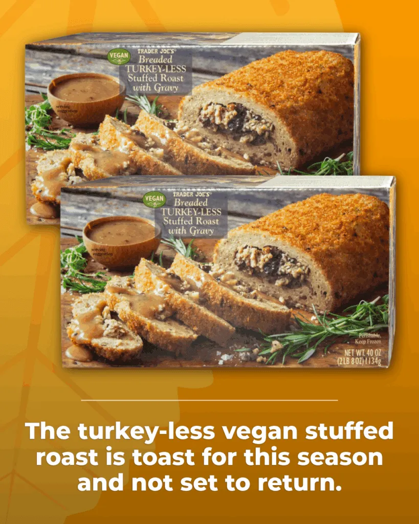 One of the most talked-about roasts in vegan circles has officially been discontinued for this year (2025 – again). The Trader Joe’s Breaded Turkey-less Stuffed Roast with Gravy, will not be returning in 2025 as confirmed by some store crew members. This roast which has been a fan favorite and holiday staple for years, was discontinued once already I. 2023 then briefly came back for the 2024 season but now looks to be officially axed again. Why? Probably low sales and it’s in a large box taking up space. Will it come back again? Who knows. I spotted it as recently as this spring still at my stores but was probably leftovers from the holiday 2024 season which in hindsight, probably wasn’t a good sign.
