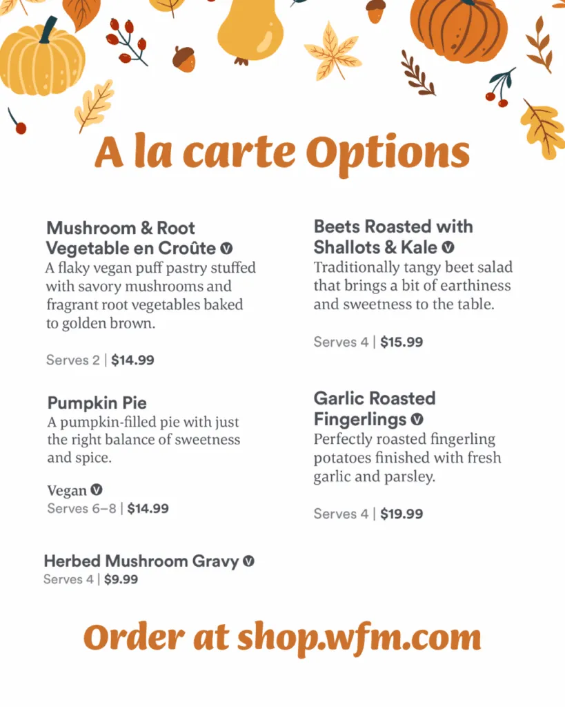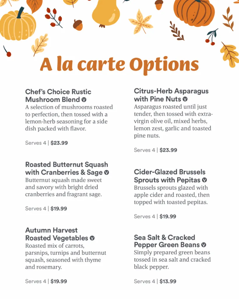 - Autumn Harvest Roasted Vegetables ($19.99) – a medley of carrots, parsnips, turnips, and butternut squash.